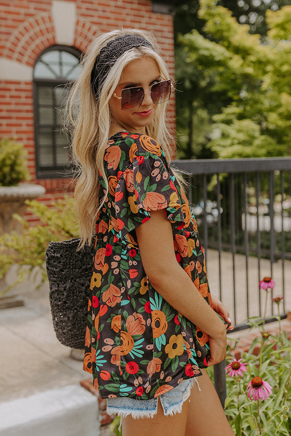 Be bold in our eye-catching black 'Memories On Repeat' top featuring lightweight material patterned with a vibrant summer floral print, a v-cut neckline and upper back with a tie closure, loose short sleeves, and a relaxed silhouette that falls into a straight hemline!