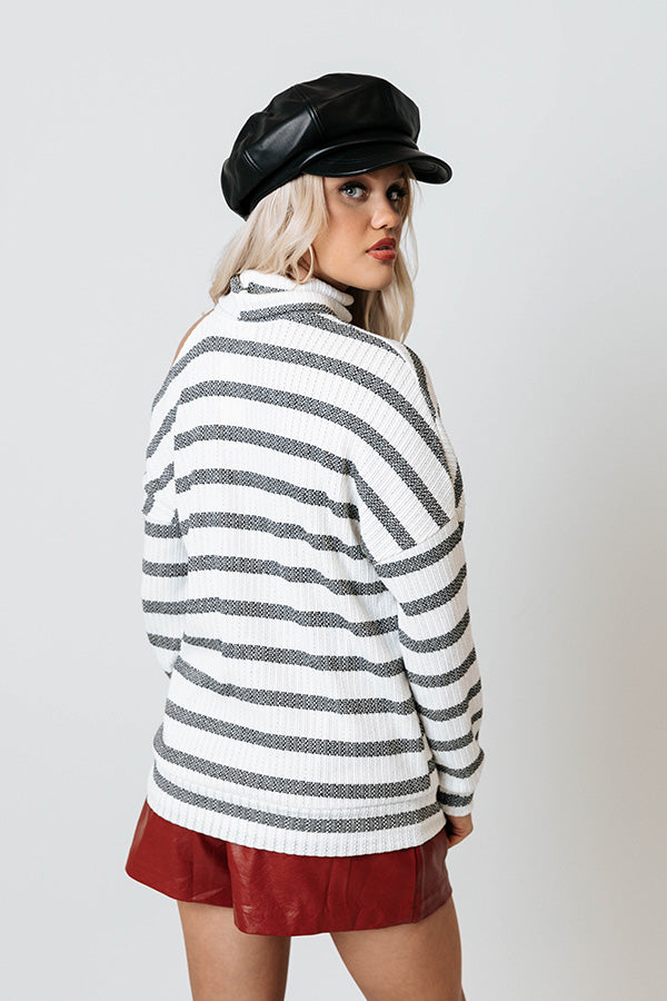 Keep your style original in this cute white top featuring soft ribbed material patterned with horizontal black stripes, a rolled turtleneck, long loose sleeves with cold shoulder cutouts and fitted cuffs, and a slouched silhouette that falls into a straight hemline!