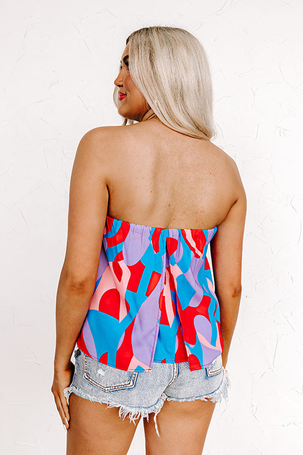 This trendy top will keep you looking on-trend this season! - Lightweight material with a colorful print - A straight elastic neckline - A strapless cut with an overlaid bodice - A relaxed silhouette that ends in a rounded hemline with a back accent slit