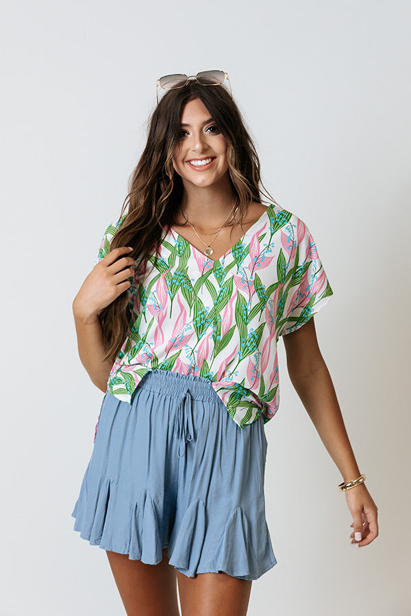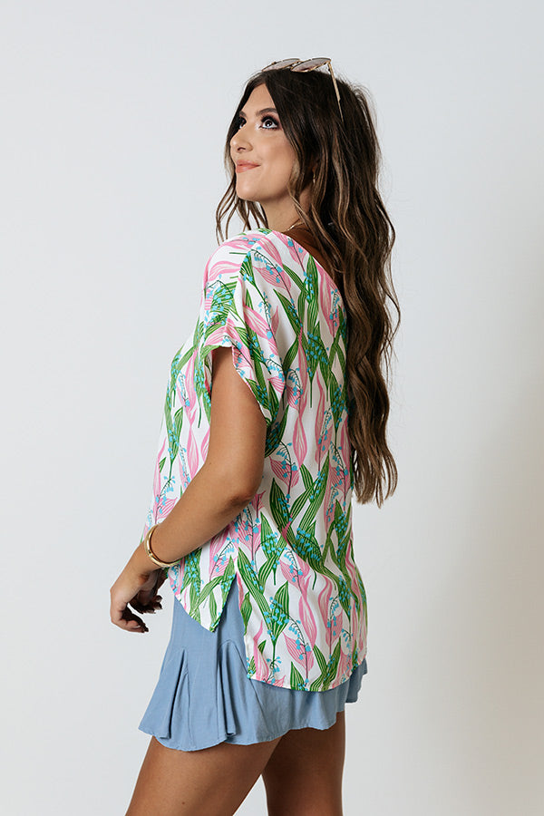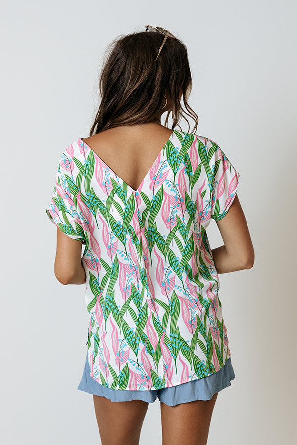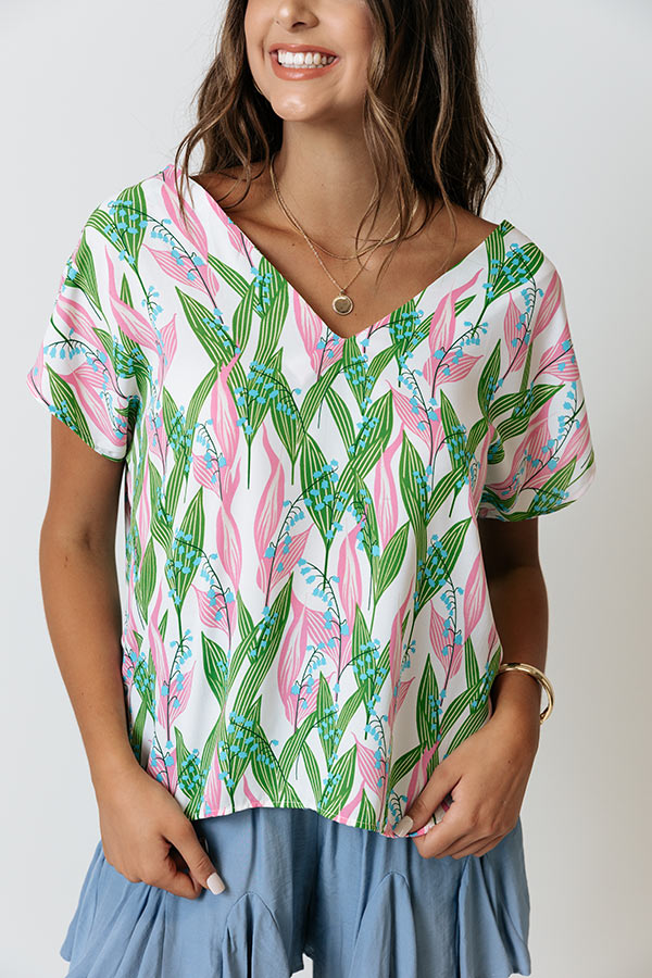 You will look like a timeless beauty when you complete your look with this cute shift top featuring lightweight breezy material patterned with a pink and green tropical leaf print, a v-cut neckline and upper back, short loose sleeves, and a relaxed silhouette that falls into a straight high/low hemline!