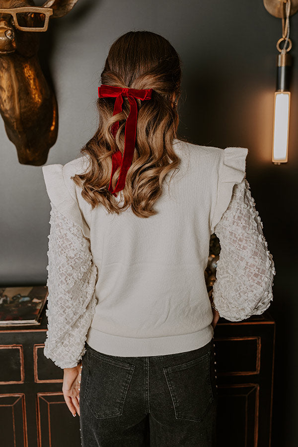 - Long lace sleeves with ruffled shoulders, ribbed knit cuffs, and a frilled lattice design