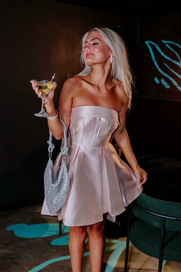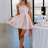 - Make a bold fashion statement with this chic dress! - Unlined material with a satin finish - A strapless neckline with an interior non-slip strip - A bodice with structured boning and side zip closure - Pleated skirt detail - A large statement bow on the back - A figure flattering silhouette that ends in a rounded mini dress length silhouette with pleated detail