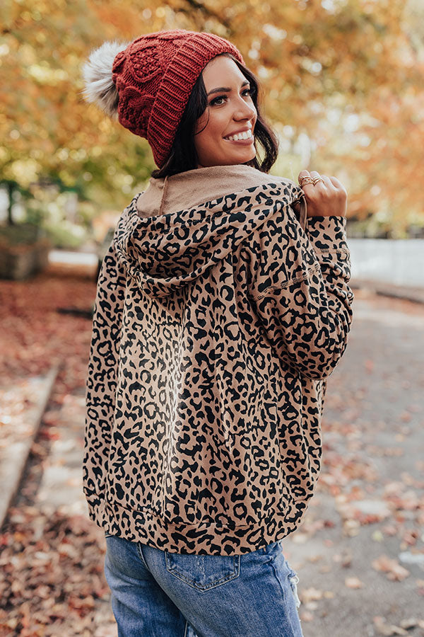 This mocha colored sweater is 'perfectly cozy' with its lightweight material, bold black leopard print, long loose sleeves, accent side pockets, zip closure front with a drawstring hooded back, and a slouched silhouette that falls into a straight hemline!