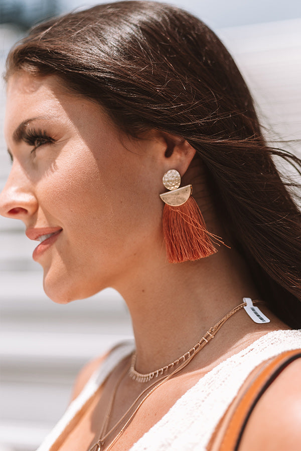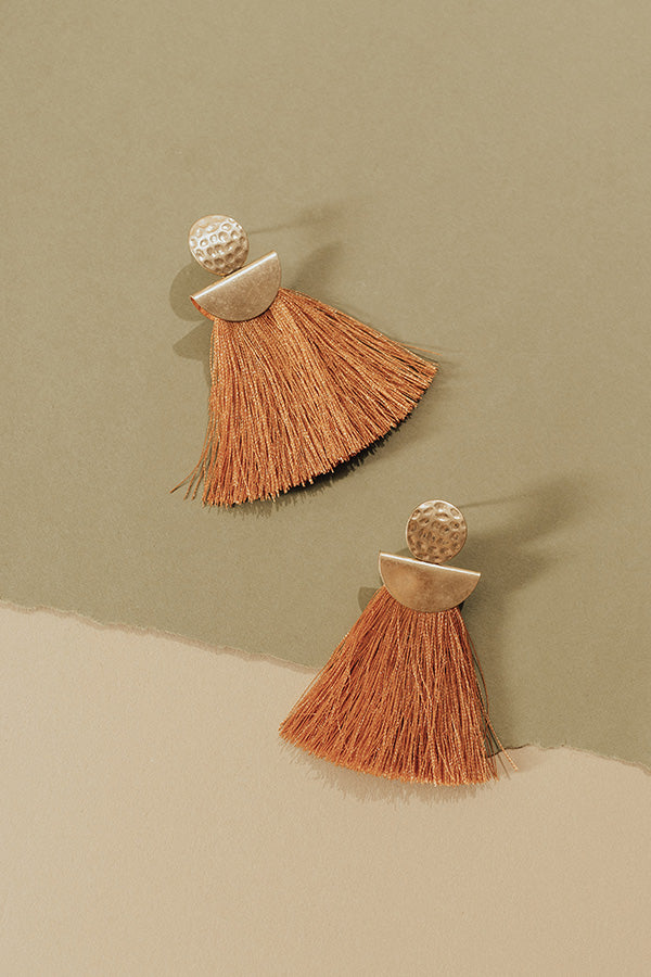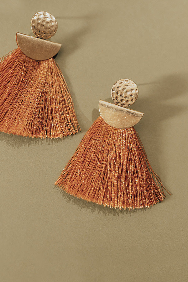 You will be on the "A list" when you wear these stunning earrings with their textured circle studs and golden half moons adorned with rust tassels!
