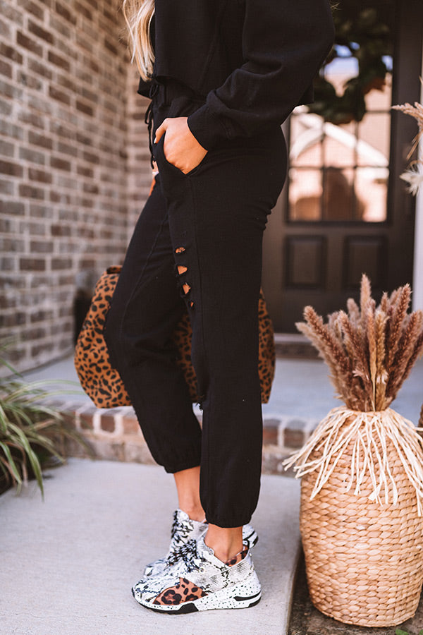 There isn't a better piece to wear when it's "a little chilly" than these adorable black joggers featuring ultra soft lightweight material with distressed detailing, a wide elastic waistline with a tie belt, accent side pockets, and a relaxed pants silhouette that falls into fitted ankle length hemlines! These comfy cuties style perfectly with our matching "A Little Chilly Crop Sweatshirt in Pink," some trendy sneakers, sunnies, and a leopard weekend tote for the ultimate two-piece everyday or lounge look! Measurements