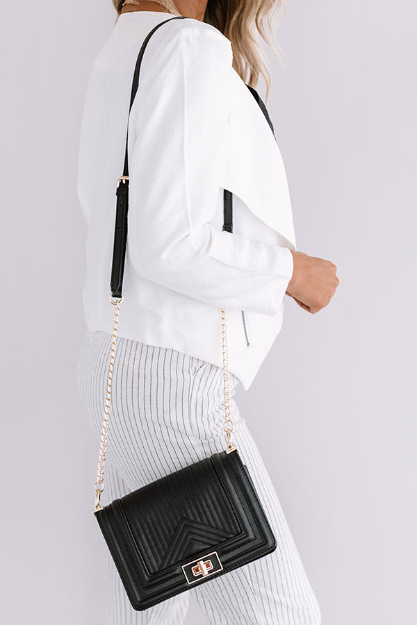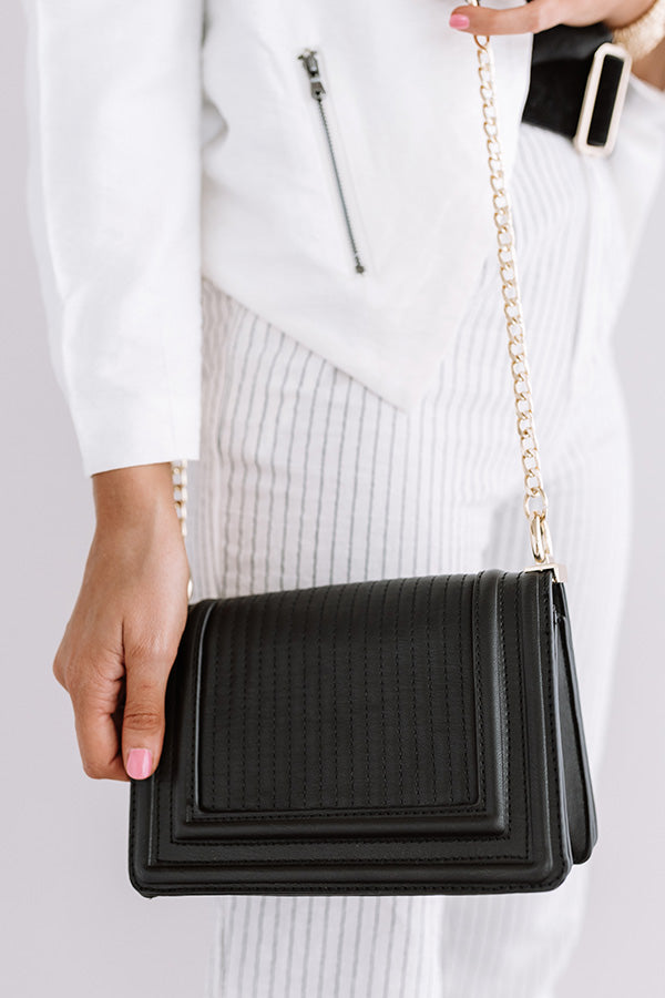 There is no better accessory to grab when you have to go in "a moment's notice" than this simple but significant black crossbody featuring sleek faux leather material with ribbed texturing, an adjustable shoulder strap with gold chain link detailing, a flap closure with a gold twist clasp accent, and a spacious rectangular pouch with additional inside pockets!