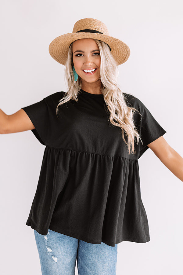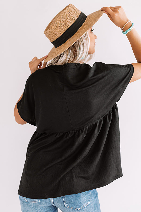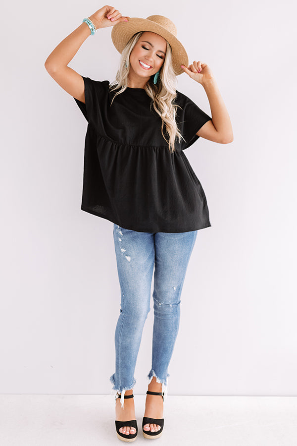 There is no better accessory to grab when you have to go in "a moment's notice" than this dainty black shift top featuring lightweight breezy material, a high rounded neckline, short loose sleeves, and a relaxed babydoll silhouette that falls into an uneven hemline! You can style this cutie a variety of ways, like with some distressed ankle skinnies, black wedges, and a woven hat, but you can also wear it with some frayed white shorts, "The Tory Snake Print Heel," and our "Neutral Territory Snake Print Tote in Black!" Measurements
