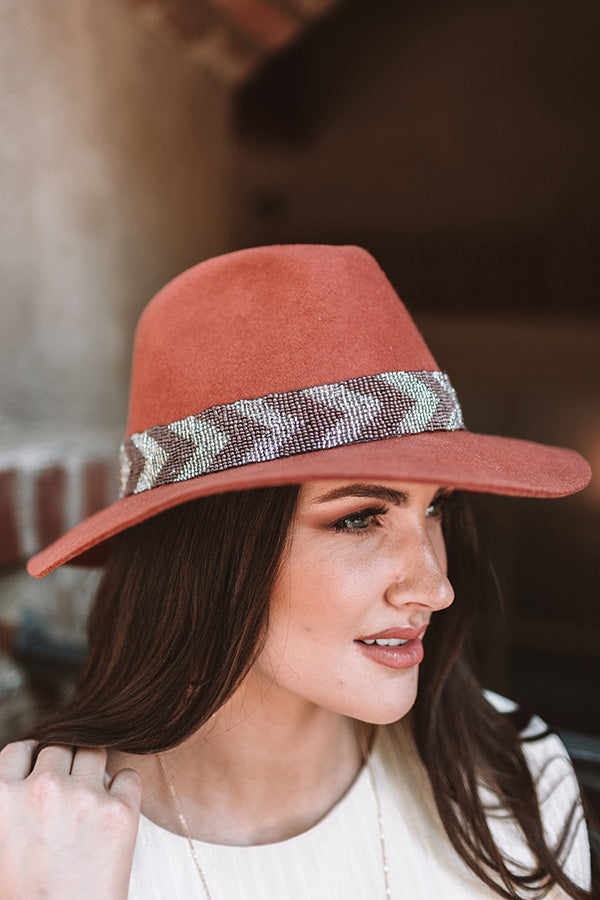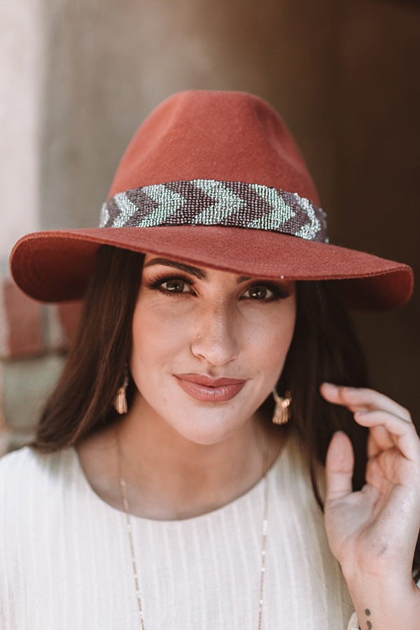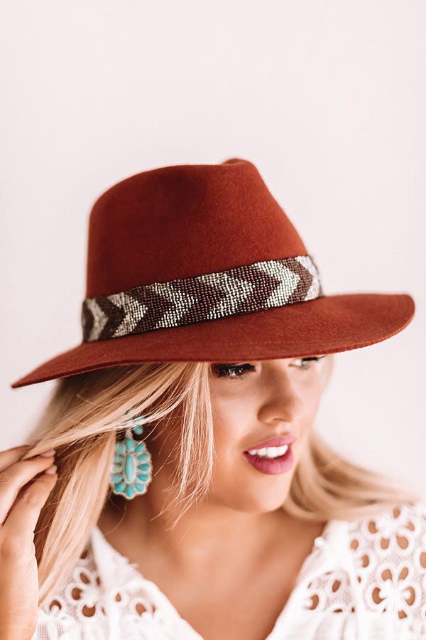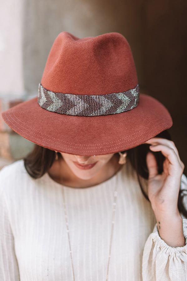 You OOTD will have "a side of chic" when you accessorize with this dark red wool hat with its wide stiff brim and thick arrow striped band!