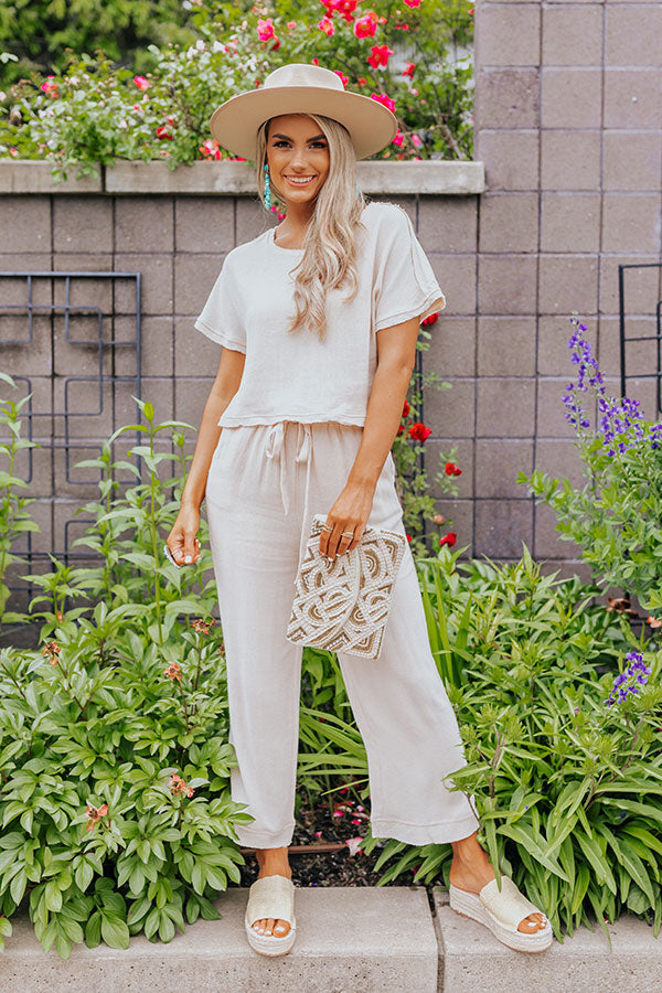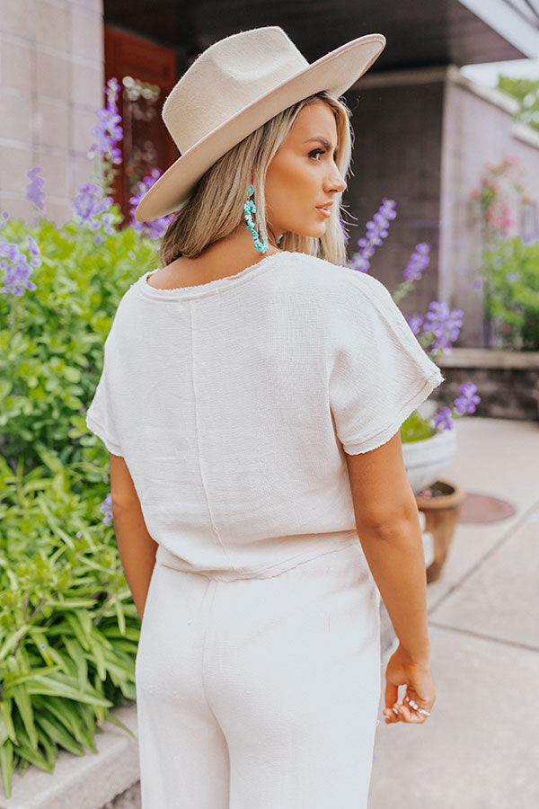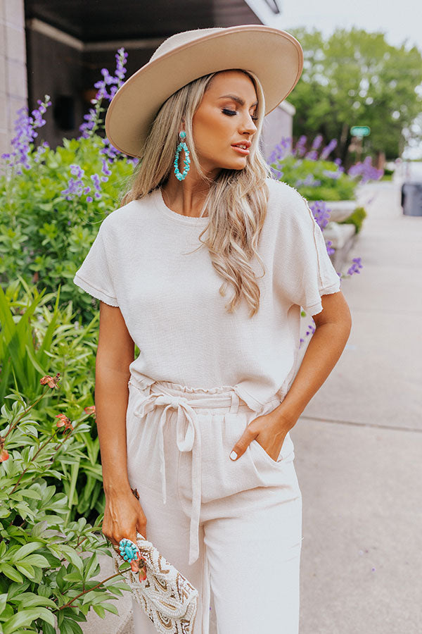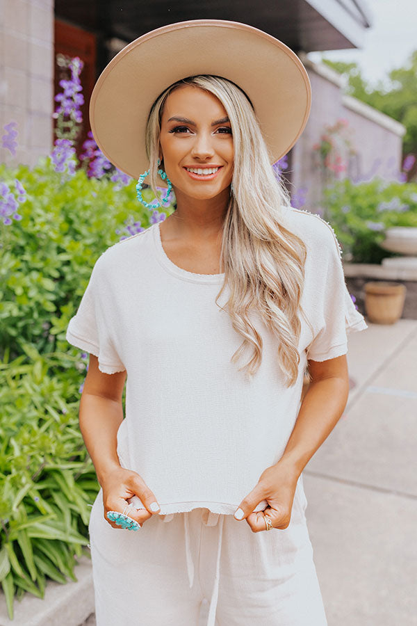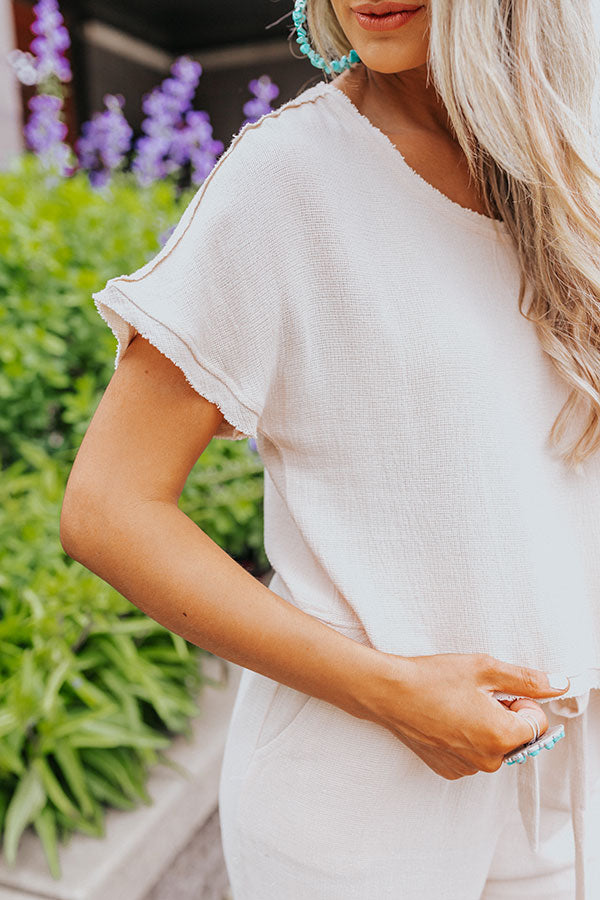 You will have more than a slice of style when you complete your look with this cream hued casual cute top featuring lightweight linen-like material, a rounded neckline, short sleeves, raw cut trim and accent seams, and a slouched silhouette that ends in a straight cropped hemline!