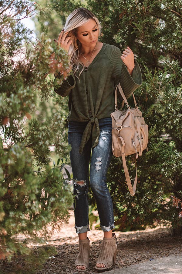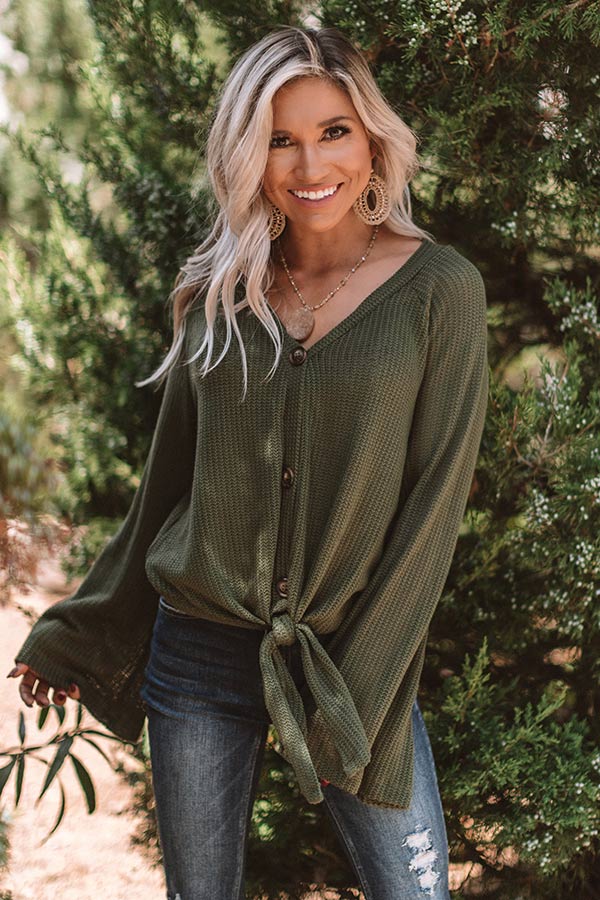 There is no reason why you can't have "a wonderful life" and a wonderful wardrobe! This casual olive top is sure to step up your fall closet with its knitted texture, lightweight material, v-cut neckline, long loose sleeves with flared cuffs, and a relaxed button down bodice that falls into a tied front hemline! You can style this simple piece with some distressed ankle skinnies, dainty jewelry, and a neutral peep toe heel and tote, or you can wear it with some black flares and snake print accents like "The Sloane" bootie and our "Twist And Shout" headband!" Measurements