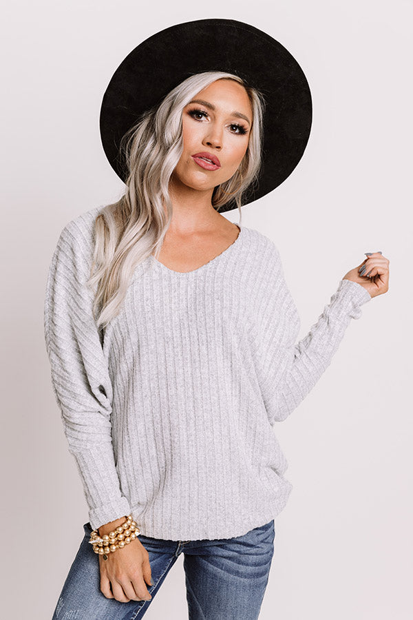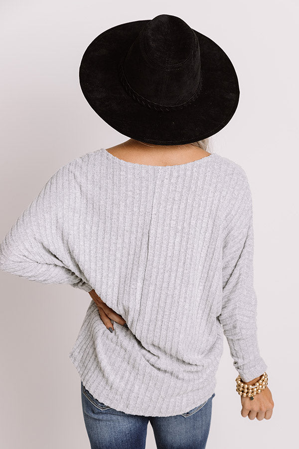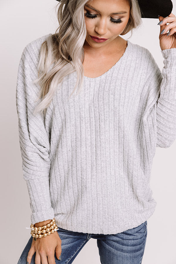 Stay stylish on the go with our casual cute grey "Above The Clouds Shift Top" featuring lightweight material with vertical ribbed texturing, a wide scooped v-cut neckline, long bat wing sleeves with fitted forearm cuffs, and a relaxed silhouette that falls into a straight hemline! Measurements
