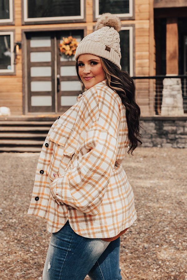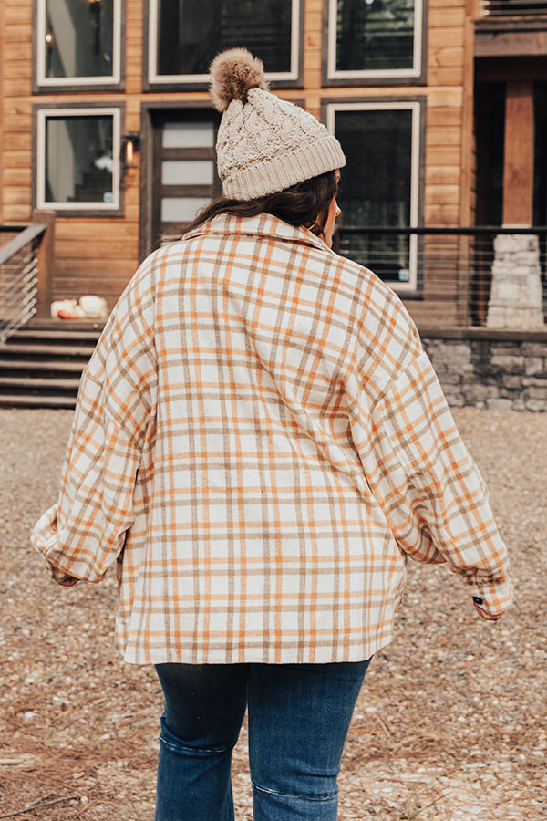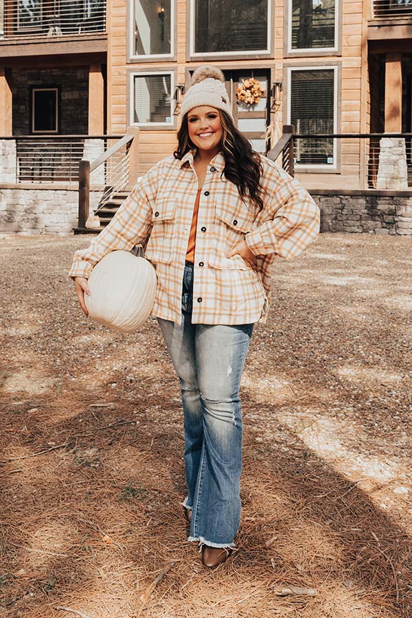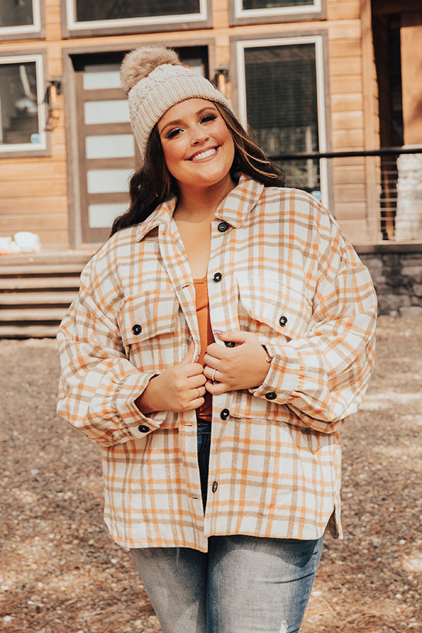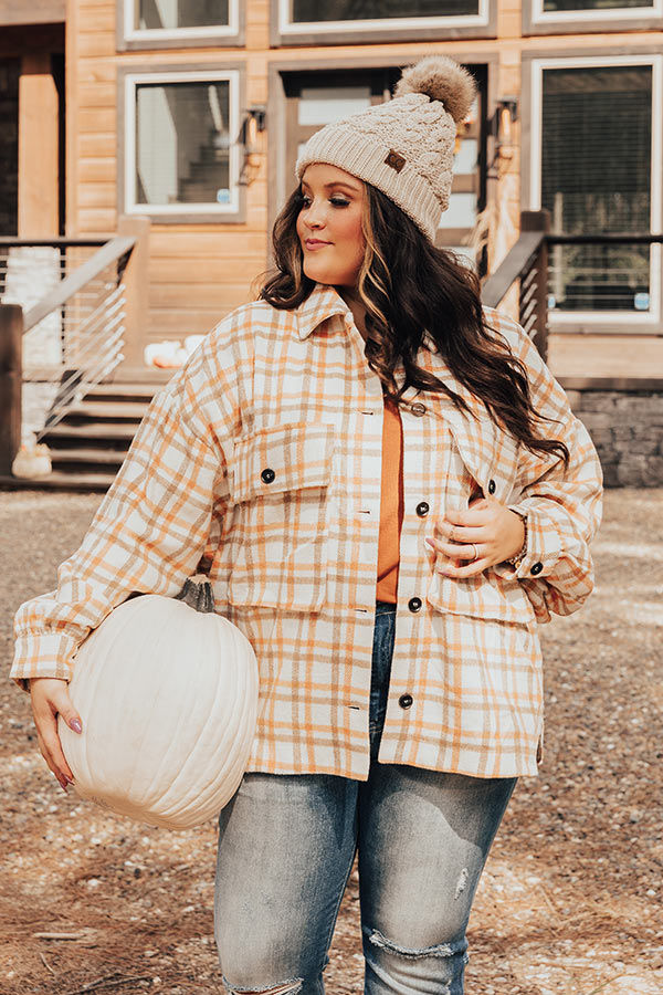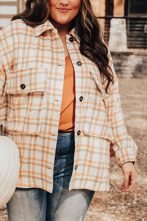 You will be the trendiest girl around when you wear our cute white plus size 'Acorn Kisses' jacket featuring warm material patterned with an orange and light brown plaid print, long loose sleeves with button closure cuffs, a button down front with a collared neckline, two accent chest pockets with flap closures, and a relaxed silhouette that falls into a straight hemline!