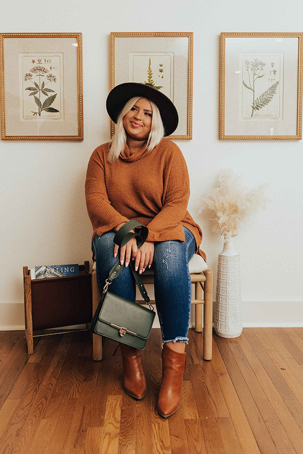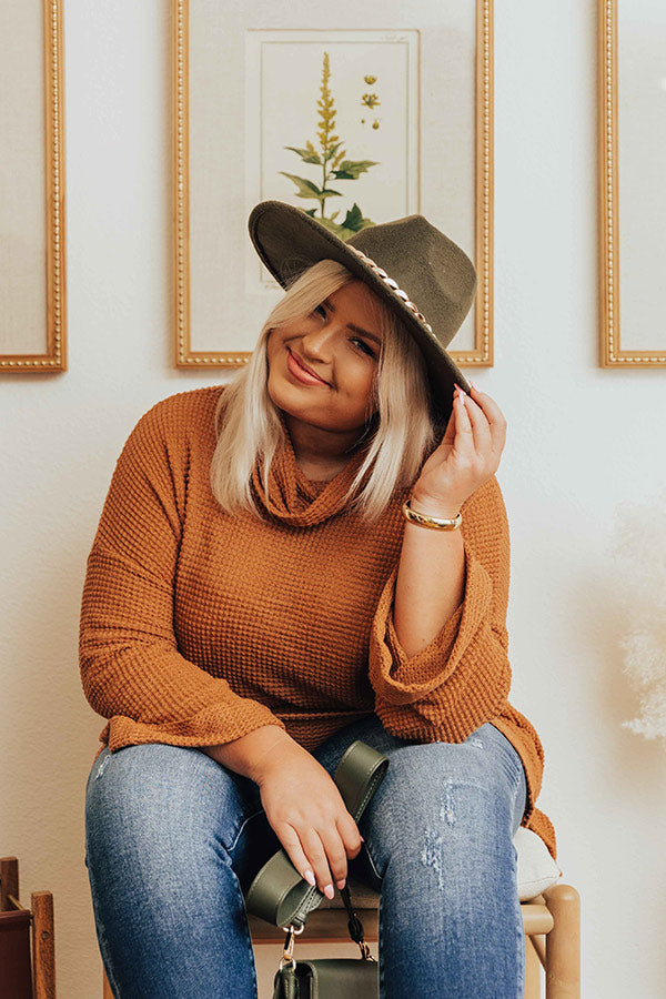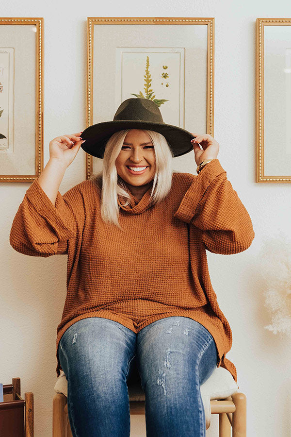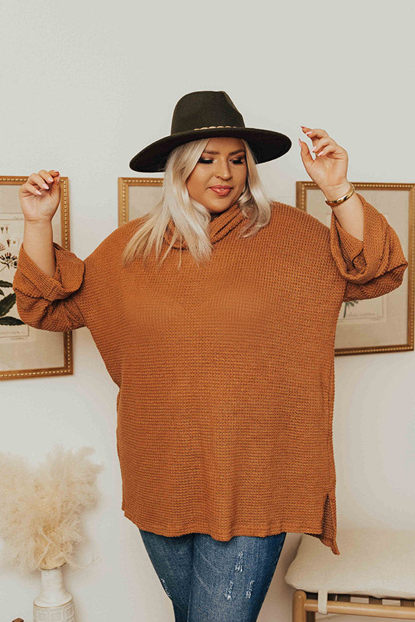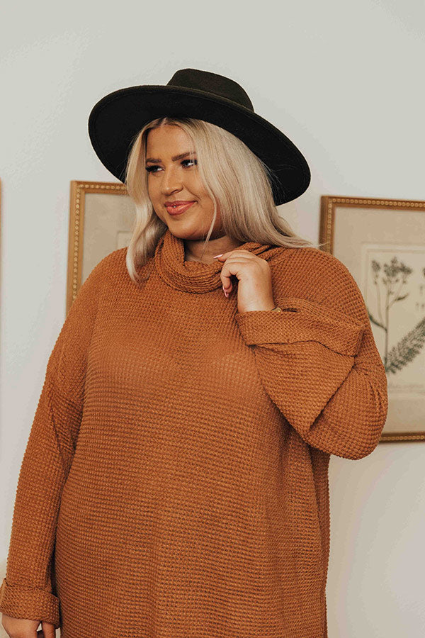 Keep it simple but stylish in our adorable plus size camel colored 'Acorn Kisses' tunic featuring lightweight material with waffle knit texturing, a draped turtle neckline, long loose sleeve with rolled cuffs, and a slouched silhouette that falls into a straight upper-thigh length hemline with accent side slits! Measurements