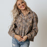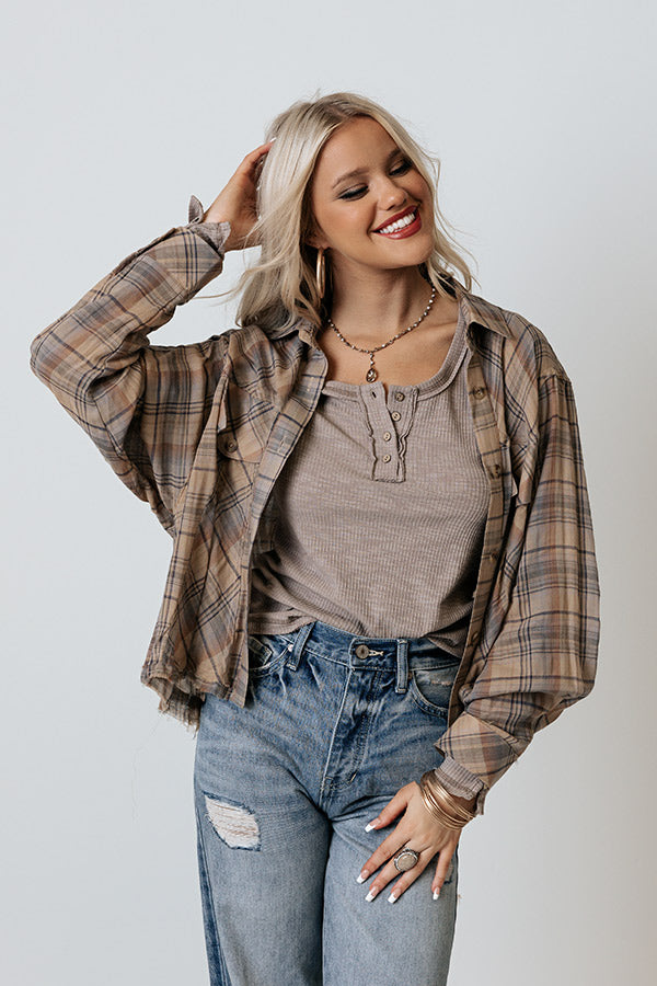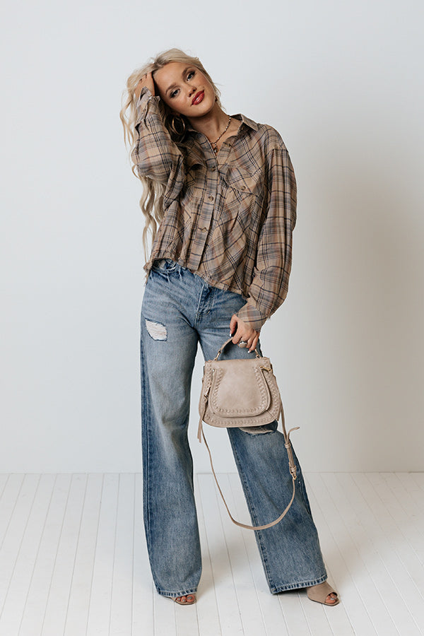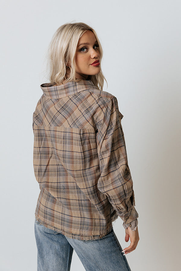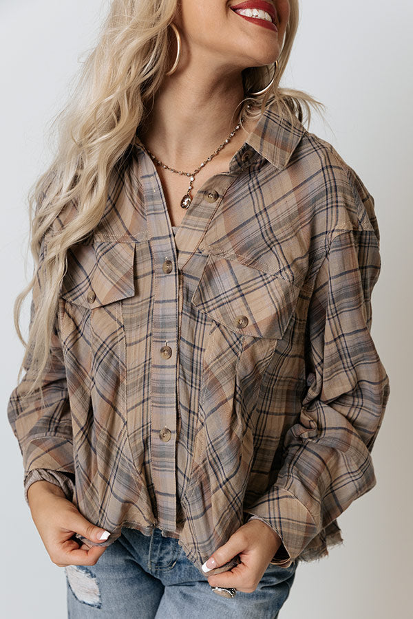 Our beige colored 'Across The Coast' top is a fall closet staple with its lightweight material, light blue and brown plaid print, button down front with a collared neckline, long loose sleeves with button closure cuffs, two accent chest pockets with flap closures, and relaxed silhouette that falls into a straight hemline with frayed trim detailing!