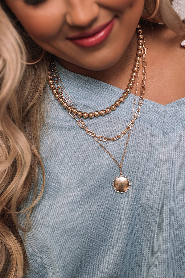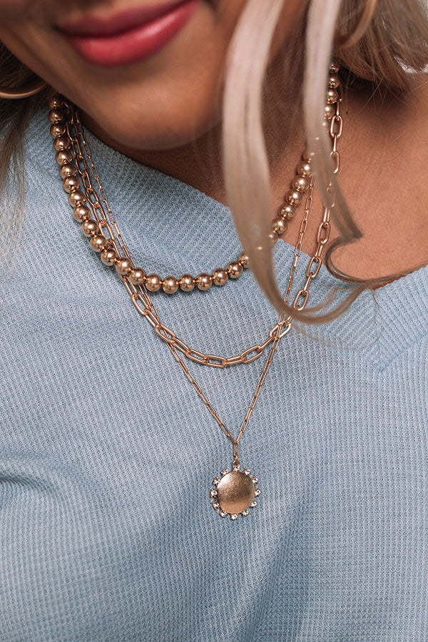 People will notice your amazing jewelry style across the room when you accessorize with this gorgeous layered necklace featuring three pieces: a gold beaded chain, a rectangular link chain, and a dainty chain with a circle rhinestone trim pendant!