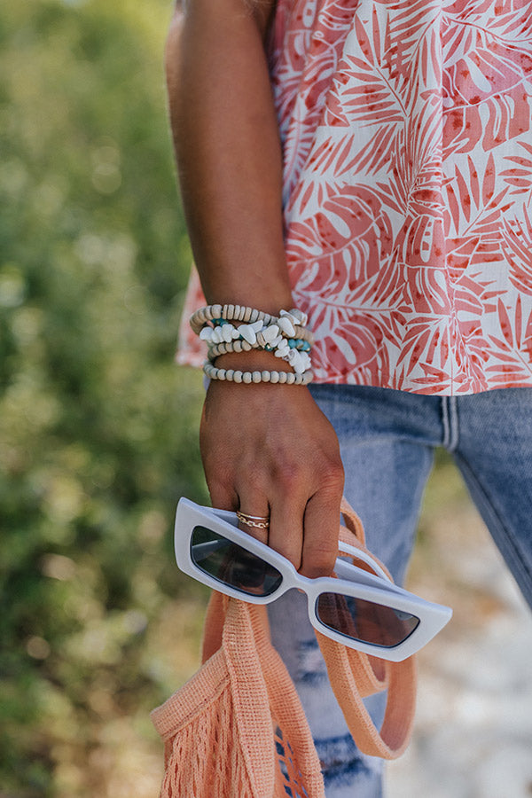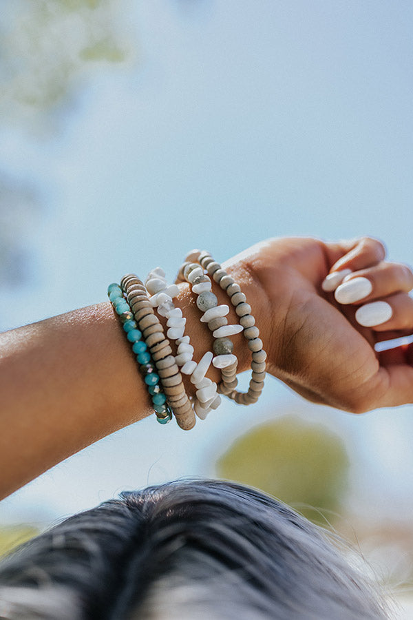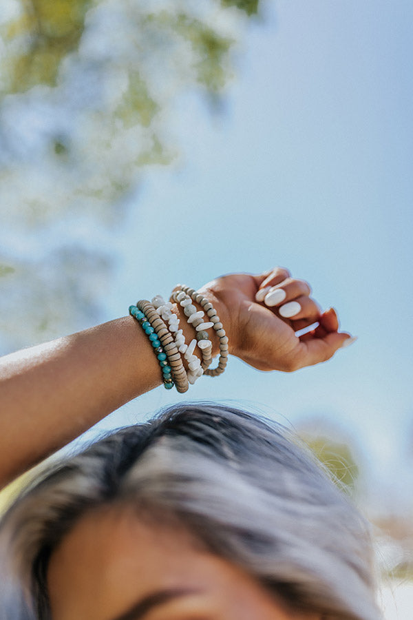 'Across The Sea' set featuring five stretch bracelets with turquoise, wood, and white stone beads!