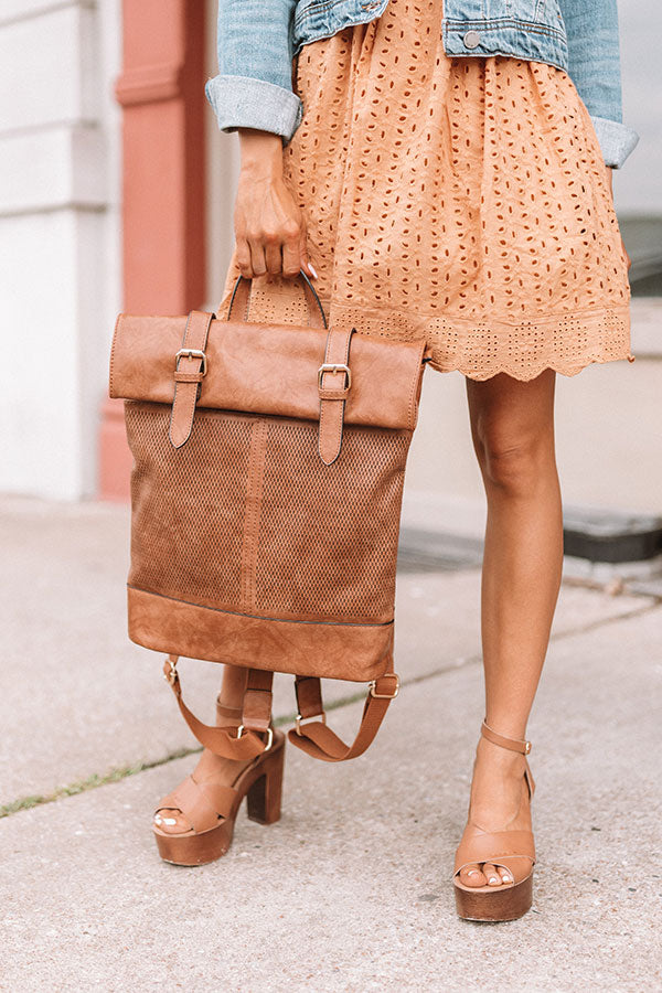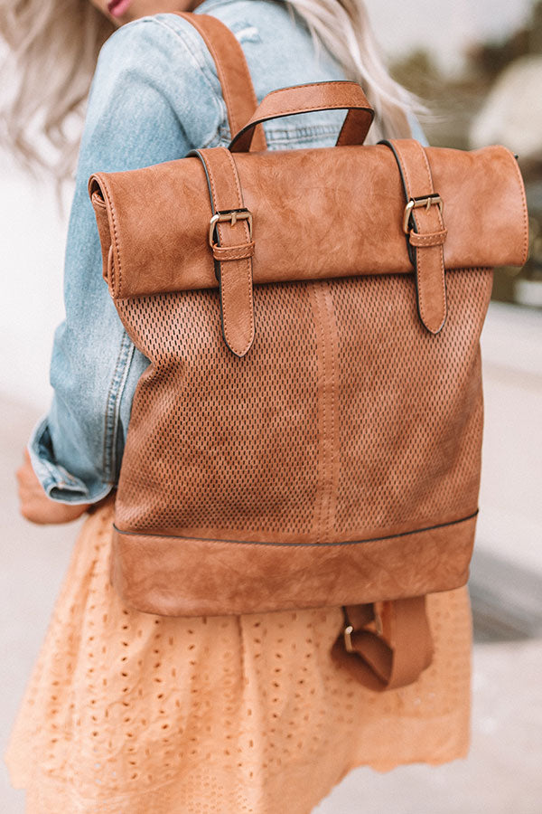 You will be carrying the trendiest bag "across the universe" when you accessorize with this brown faux leather backpack featuring a double snap closure with a folded flap and accent buckles, a perforated outside, a spacious zippered pouch, two adjustable shoulder straps, and an outside zipper pocket on the back!