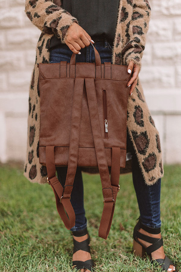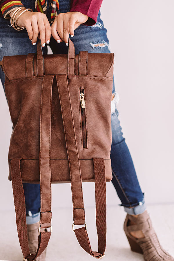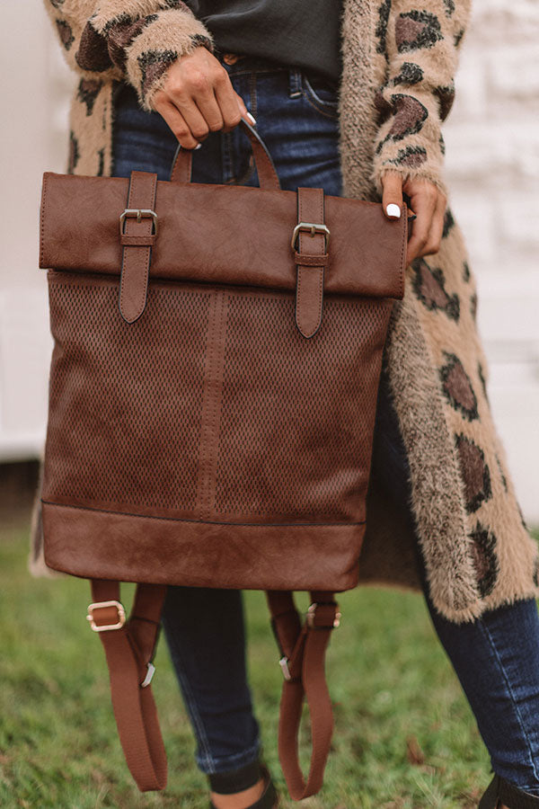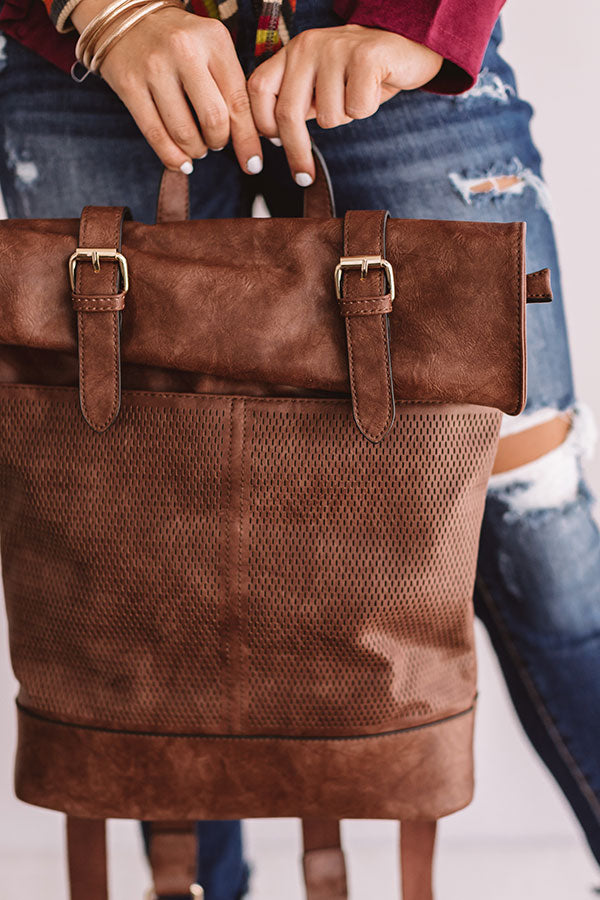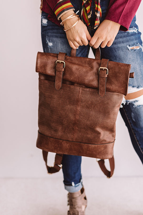 You will be carrying the trendiest bag "across the universe" when you accessorize with this chestnut faux leather backpack featuring a double snap closure with a folded flap and accent buckles, a perforated outside, a spacious zippered pouch, two adjustable shoulder straps, and an outside zipper pocket on the back!