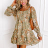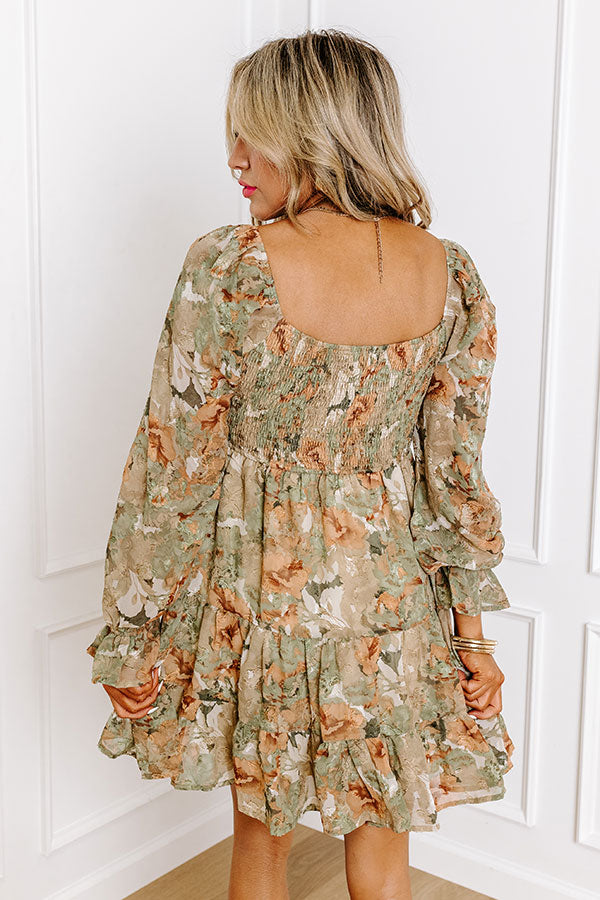 We have no doubt you will be addicted to this lovely dress featuring lightweight material patterned with a golden honey and pear hued floral print, a wide scooped neckline, long bishop sleeves with flared cuffs, a flattering smocked bodice, and a flirty tiered skirt silhouette that falls into an uneven mid-thigh length hemline!