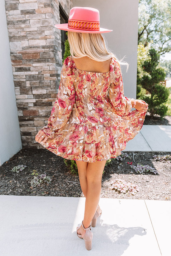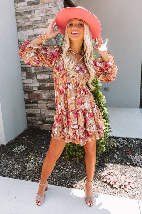 We have no doubt you will be addicted to this lovely dress featuring lightweight material patterned with a golden honey and rose hued floral print, a wide scooped neckline, long bishop sleeves with flared cuffs, a flattering smocked bodice, and a flirty tiered skirt silhouette that falls into an uneven mid-thigh length hemline! Measurements