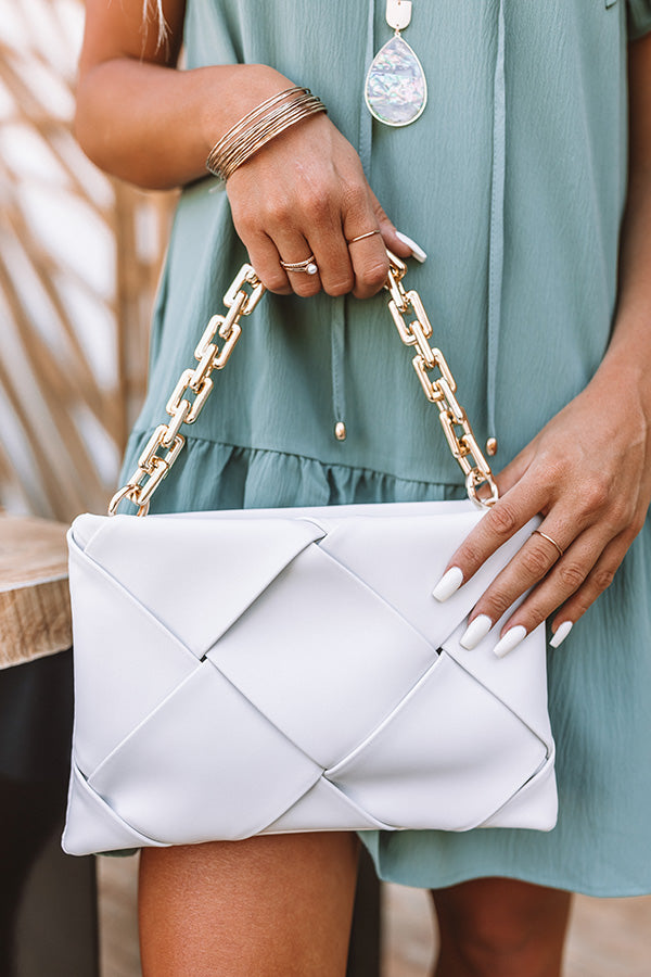 The chicest of handbags, our luxe stone colored 'Address The Room' clutch features oversized woven faux leather material, a removable and adjustable shoulder straps, a chunky gold chain link handle, and a spacious interior with a zip closure and an additional inside pocket!