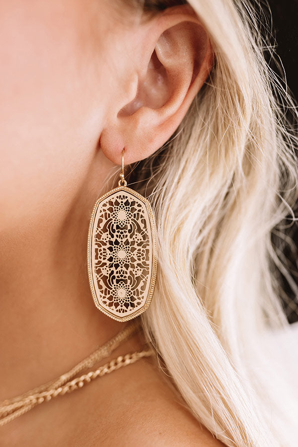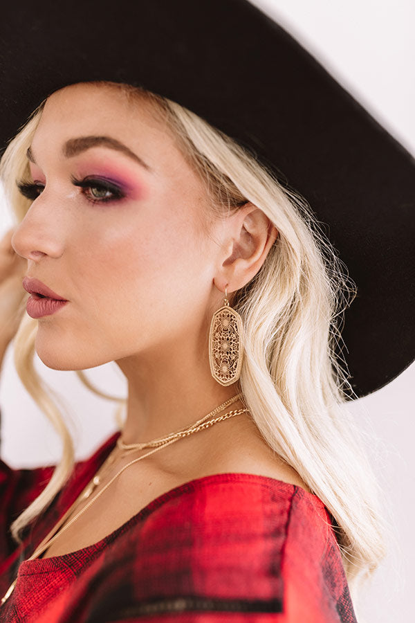 Everyone will "adore you more" when you wear these statement earrings featuring a dangling pendant with intricate and dainty gold cutout detailing!