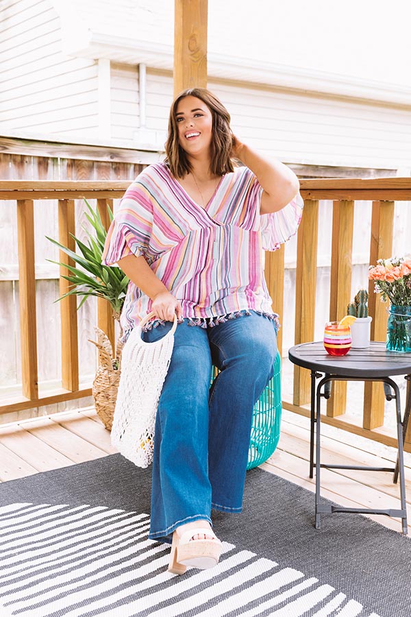 Plus Size - We have no doubt you will adore this unique top featuring lightweight material patterned with colorful accent stripes, a v-cut neckline, short loose sleeves with draped ruffle cuffs, and a relaxed silhouette that falls into a rounded hemline with accent tassel trim! We have styled this cutie with some denim flares and a woven block heel and net bag, but you can also wear it with some white skinnies, "The Brighton Espadrille in Airy Blue," and our "Relaxing Poolside Sunnies in Purple!" Measurements