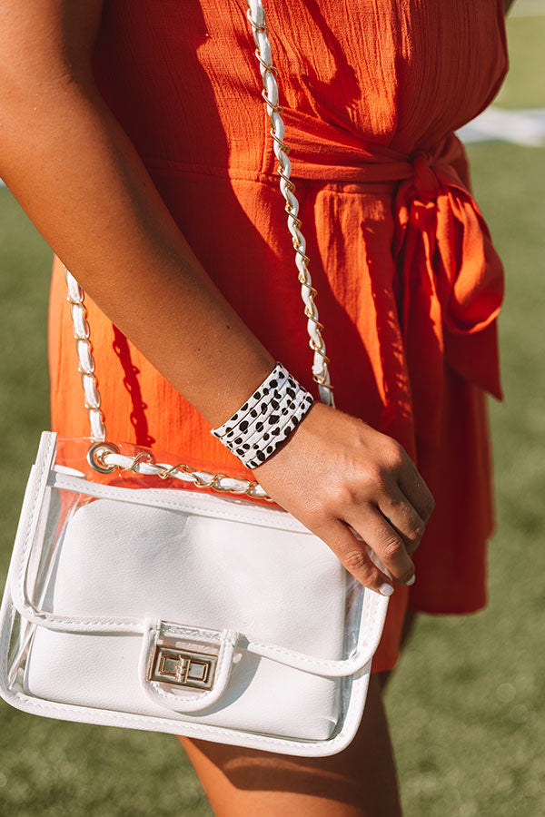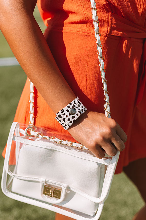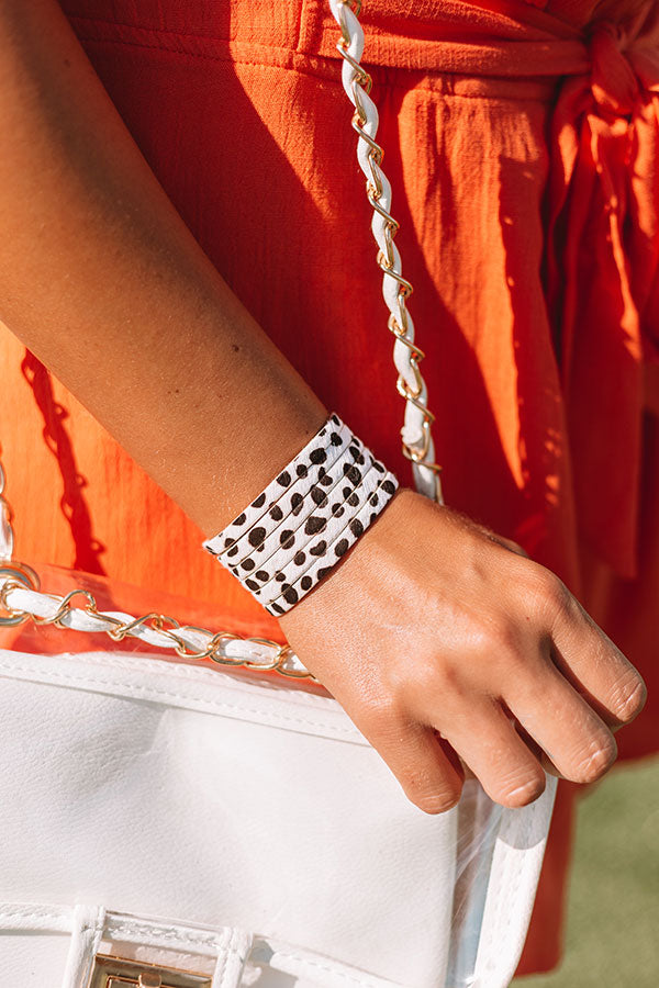 What better way to show off your jewelry style than during game day! This faux leather bracelet looks gorgeous paired with your fave game day tee with its ivory leopard straps connected by a two snap closure!