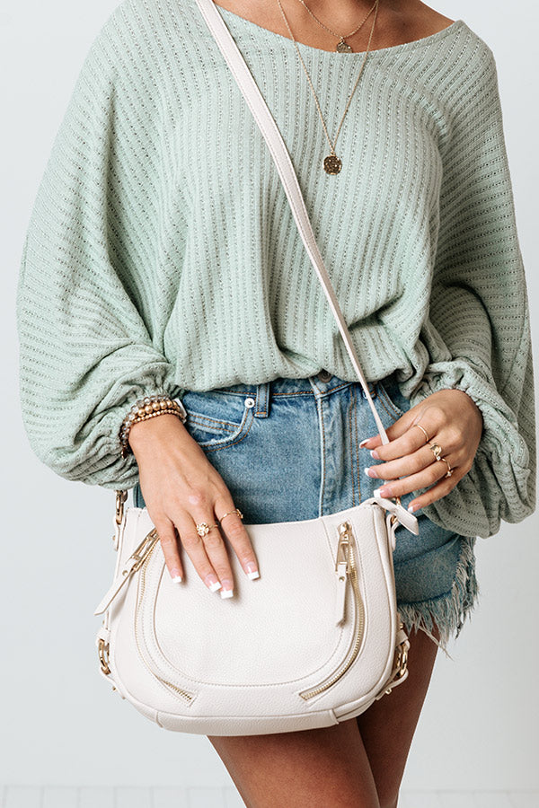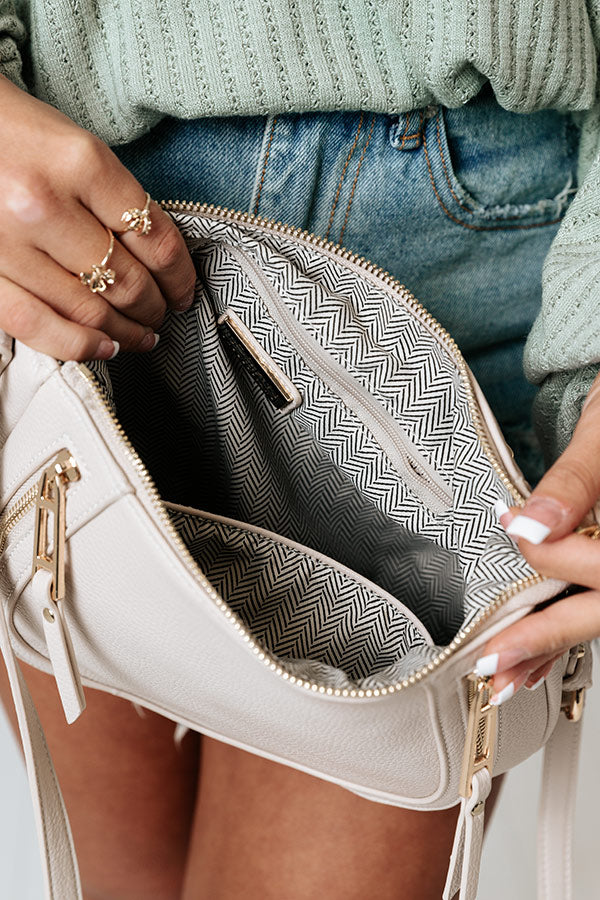 There is no better bag to carry with you on an adventure than this versatile birch colored crossbody featuring faux leather material, an adjustable shoulder strap, two accent zippers on the front, a rounded silhouette, and a spacious fully lined pouch with a zip closure and an additional inside pocket!