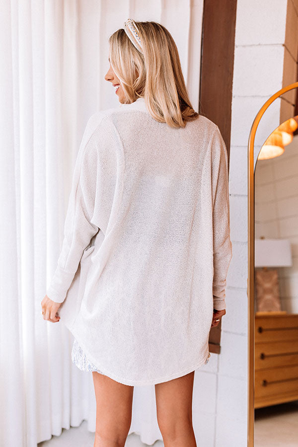 There is no better piece to throw on for an after work social outing than this adorable birch colored cardigan featuring soft lightweight knit material, long sleeves, accent side pockets, and a draped open front silhouette that falls into a straight tunic-length hemline! Measurements