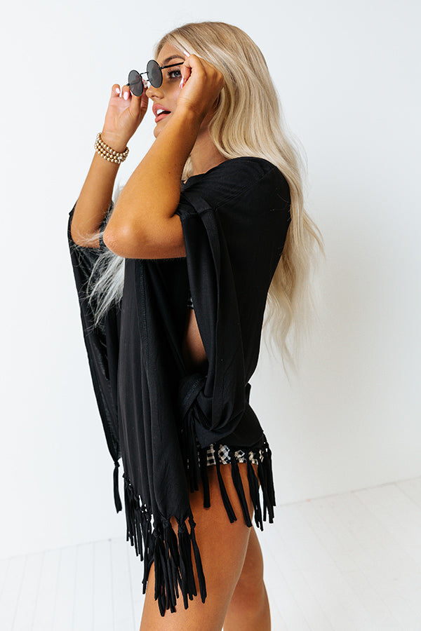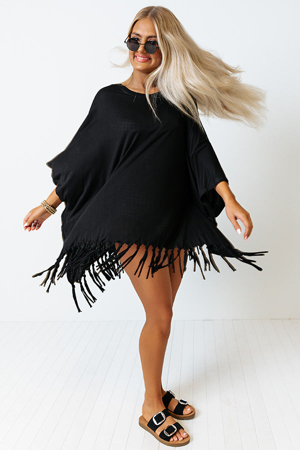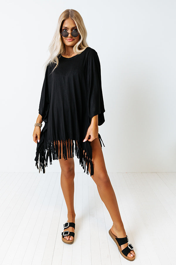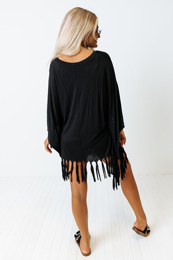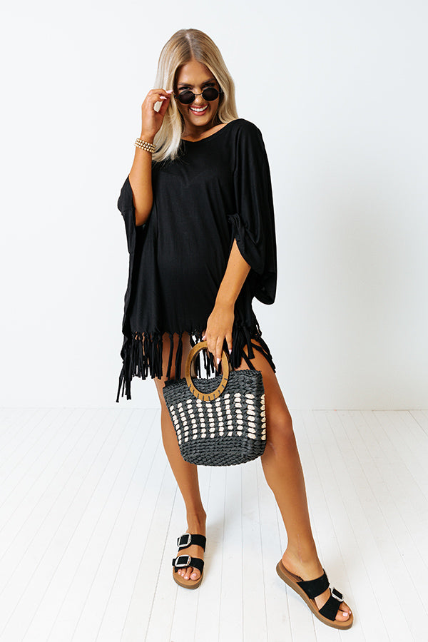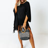 Perfect for wearing to the beach or pool, our versatile black 'Afternoon Sail Swimsuit Cover Up' featuring lightweight material, a rounded neckline, loose half bet wing sleeves, and an ultra draped silhouette that falls into a straight tunic-length hemline with fringe trim detailing!