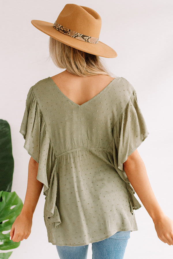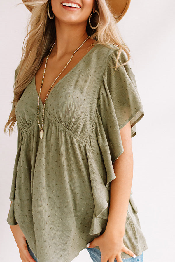 You will undoubtedly be dressed "ahead of the curve" when you wear this adorable marigold colored top featuring soft lightweight material with subtle polka dot texturing, a v-cut neckline, short attached sleeves with draped detailing, and a relaxed babydoll silhouette that falls into an uneven hemline! We have styled this cutie with some distressed skinnies, snake print booties, and a neutral fringe crossbody and faux suede hat, but you can also wear it with some frayed white shorts and "The Magnolia Espadrille Wedge in Olive!" Measurements