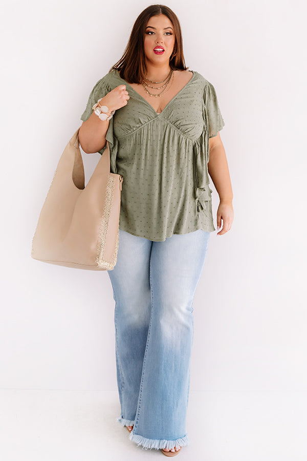 Plus Size - You will undoubtedly be dressed "ahead of the curve" when you wear this adorable olive colored top featuring soft lightweight material with subtle polka dot texturing, a v-cut neckline, short attached sleeves with draped detailing, and a relaxed babydoll silhouette that falls into an uneven hemline! We have styled this adorable piece with some light wash flares, brown heels, and a tan faux leather tote, but you can also wear it front tucked into some distressed white shorts, "The Brighton Espadrille in Grey," and our "All Caught Up Headband in Grey!"