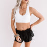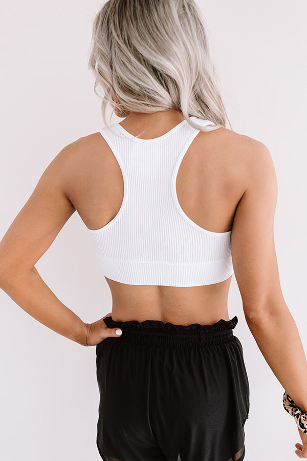 You will be "aligned for success" when you wear this adorable white bra featuring soft lightweight stretchy material with subtle ribbed texturing, a scooped neckline, 1-inch shoulder straps with a racerback fit, and a form fitting silhouette that falls into a wide waistband! This adorable athleisure piece styles perfectly with some sporty shorts or comfy joggers and trendy sneakers or slippers for the ultimate two-piece workout or lounge set! Measurements