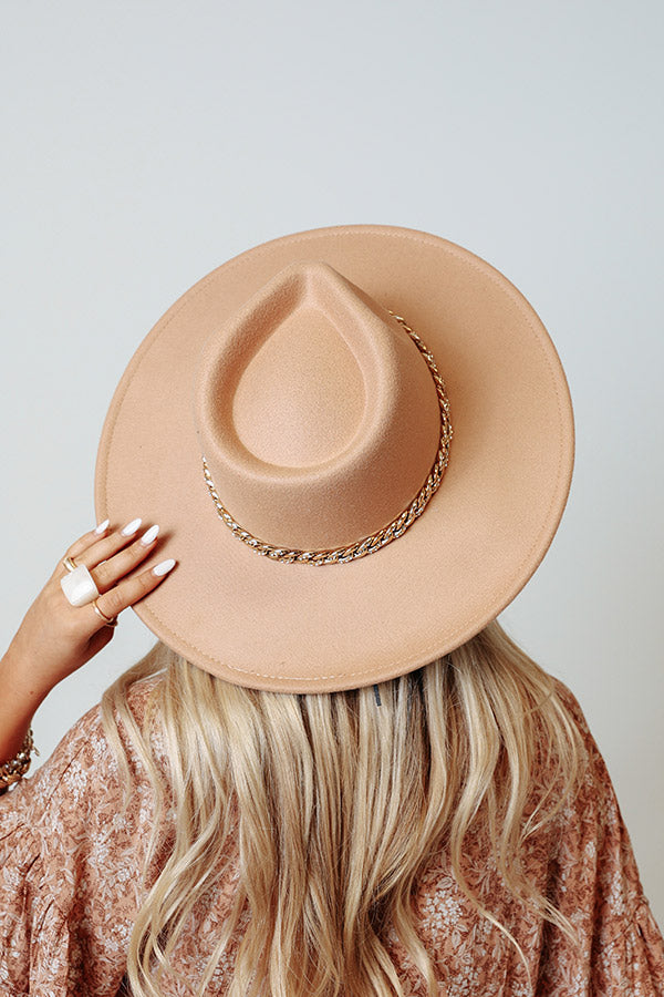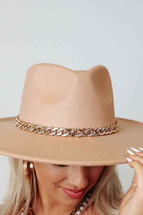 Top off your look in the fabulous of ways with our pretty iced latte colored 'All Brand New Fedora' featuring lightweight material, a stiff 3.5-inch brim, and a gold chain band accent!