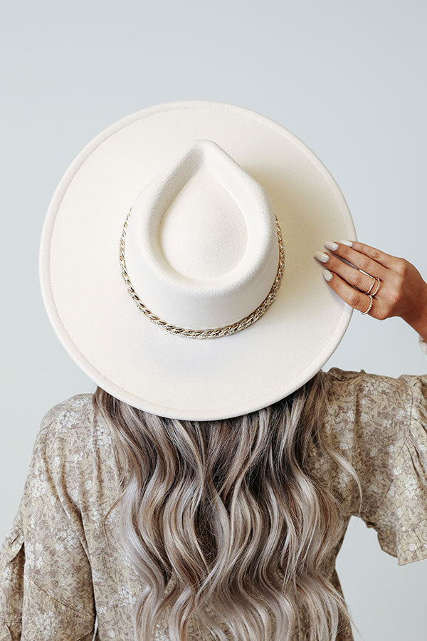 Top off your look in the fabulous of ways with our pretty ivory colored 'All Brand New Fedora' featuring lightweight material, a stiff 3.5-inch brim, and a gold chain band accent!