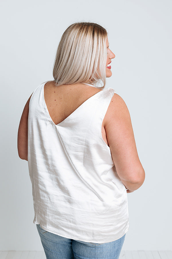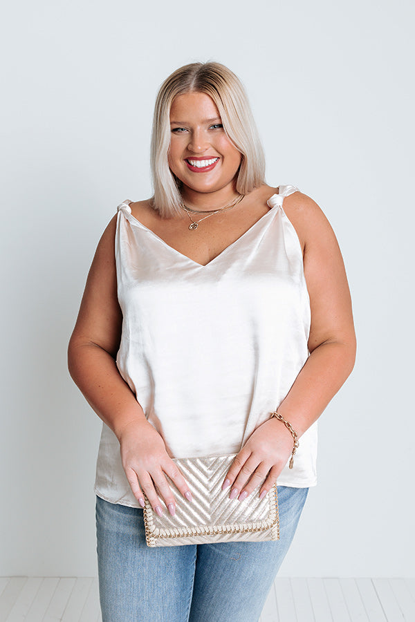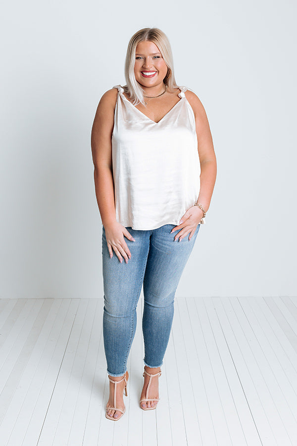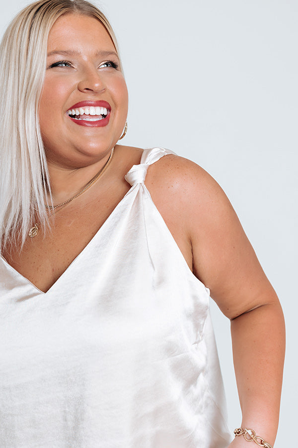 All eyes are sure to be on you when you arrive in this elegant champagne colored plus size top featuring lightweight satin material, a v-cut neckline and upper back, sleeveless shoulder straps with a knot detail in the front, and a relaxed but flattering silhouette that falls into a straight hemline!
