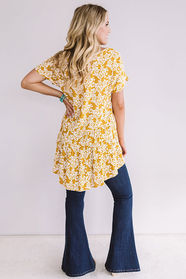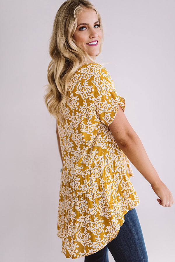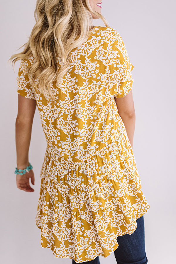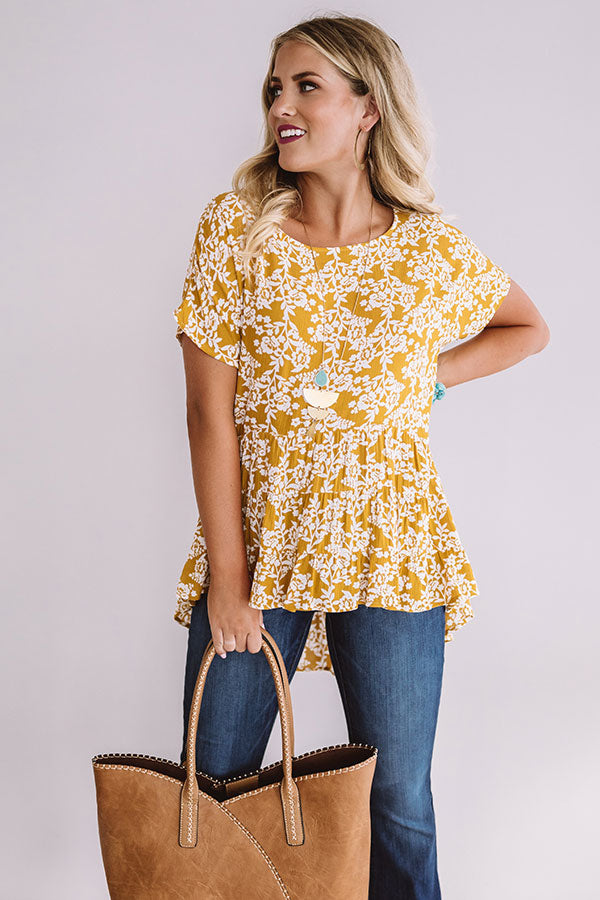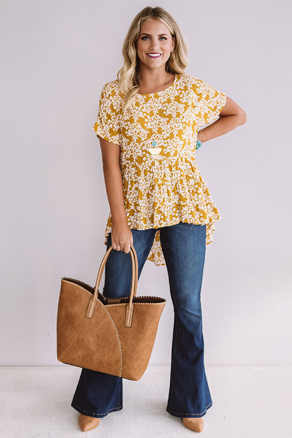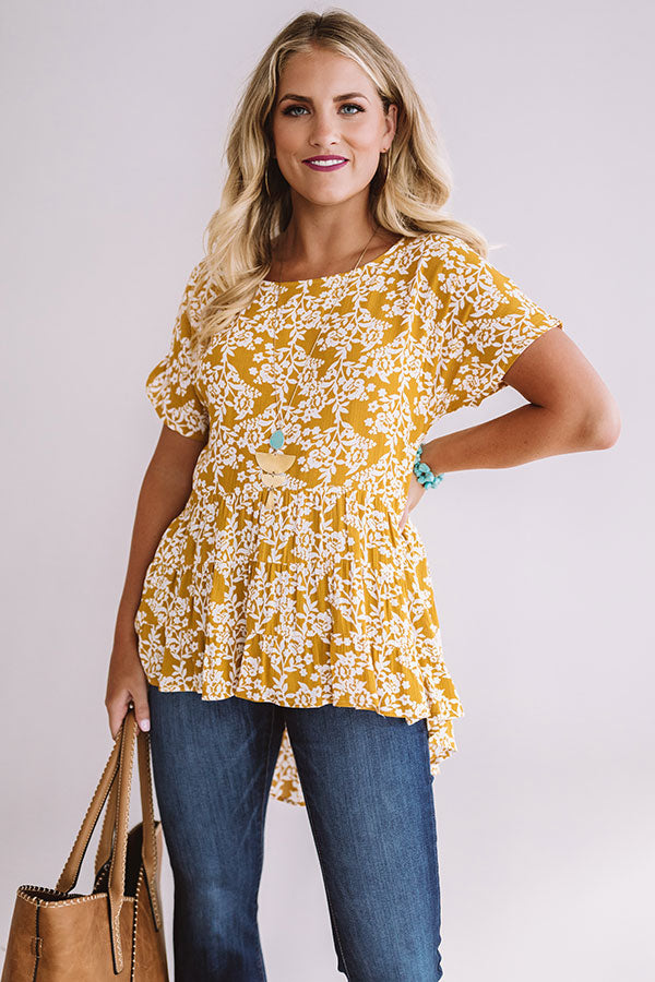 Keep your transitional style versatile with the "All My Love" shift top featuring a mustard and white floral pattern, lightweight material, a high rounded neckline, short sleeves, and a fitted bodice that falls into a high/low peplum bottom with an uneven hemline! This piece can be styled for the chillier fall weather with some dark denim flares, turquoise statement jewelry, and a brown pointed bootie and tote, or you can wear it with some distressed white shorts, "The Tipton Espadrille in White," and our ''Say It Ain't Soho Hat in Marigold" for the warmer summer days! Measurements