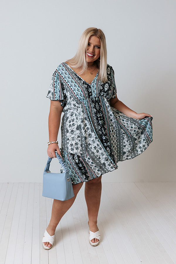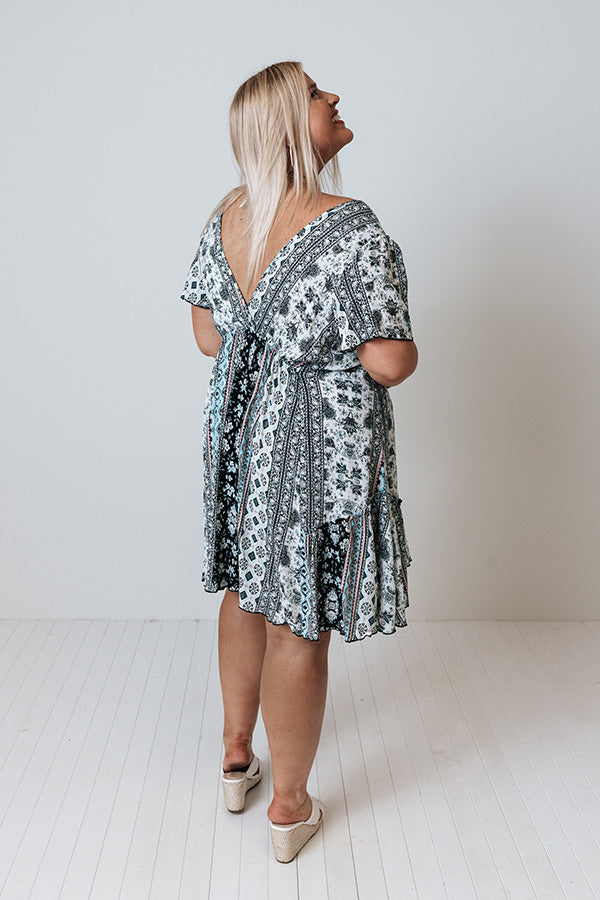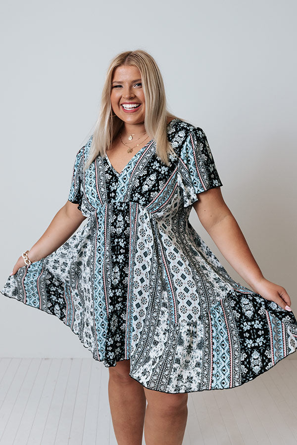 Plus Size - We think this darling black dress deserves all your love with its lightweight breezy material, intricate white and blue floral print, wide v-cut neckline and upper back that can be worn off one shoulder, short draped sleeves, and an ultra relaxed babydoll silhouette that falls into an uneven mid-thigh length hemline! Measurements