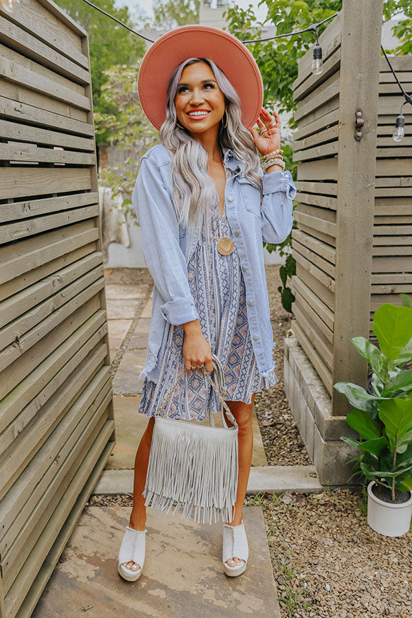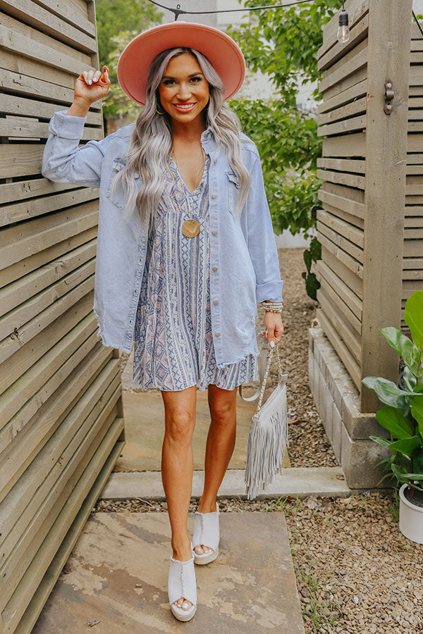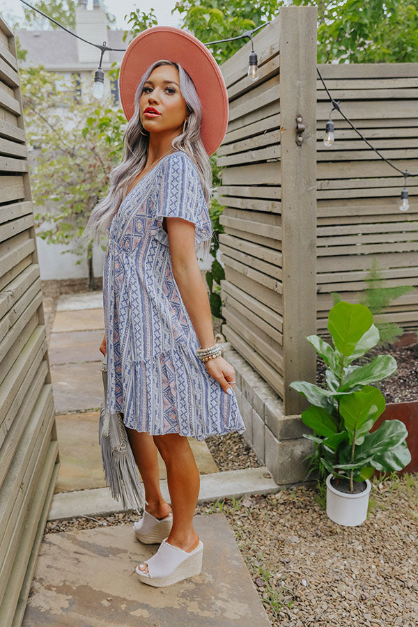 We think this darling periwinkle colored dress deserves all your love with its lightweight breezy material, intricate white and pink floral print, wide v-cut neckline and upper back that can be worn off one shoulder, short draped sleeves, and an ultra relaxed babydoll silhouette that falls into an uneven mid-thigh length hemline! Measurements