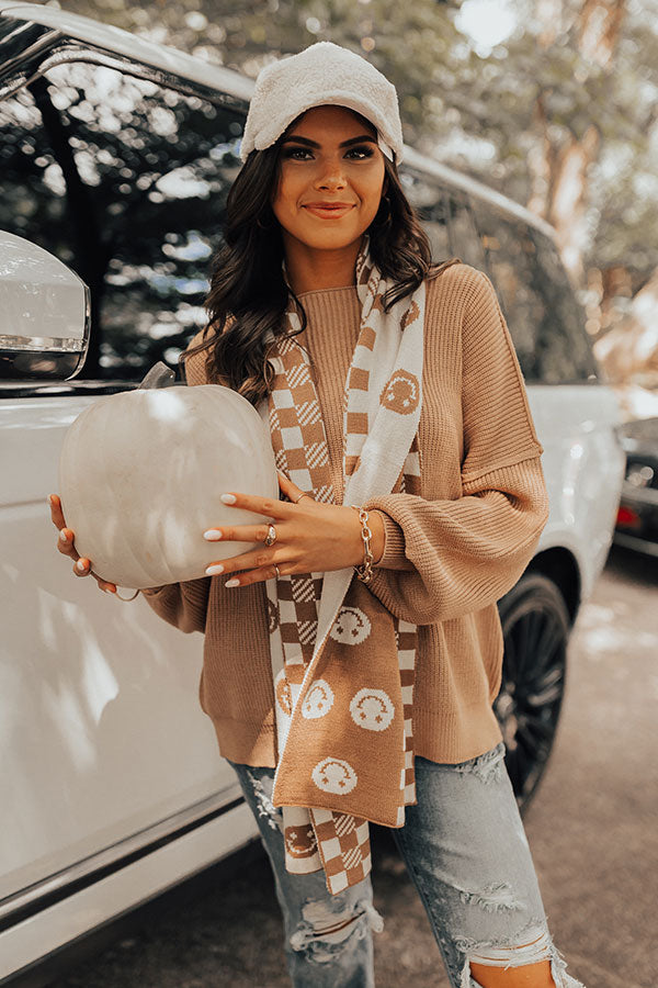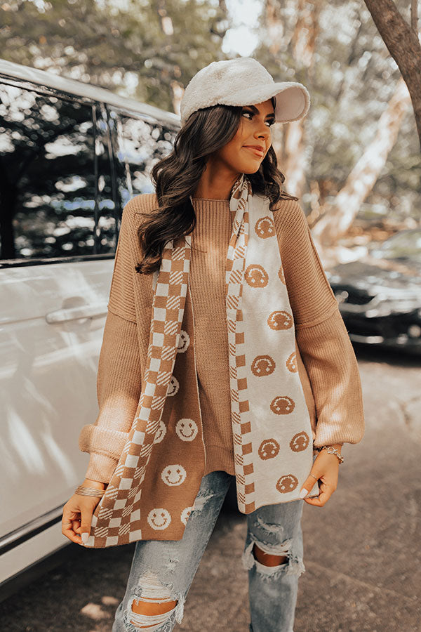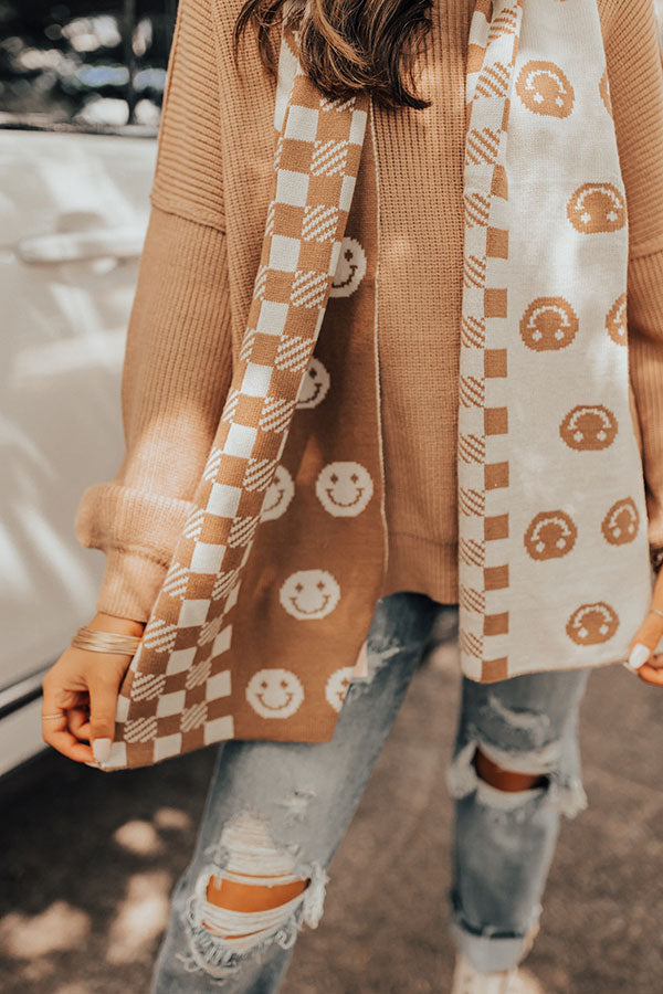 We have no doubt you will be all smiles when you wrap yourself in this adorable scarf featuring warm knit material patterned with a brown checkered and smiley face print!