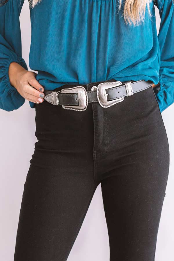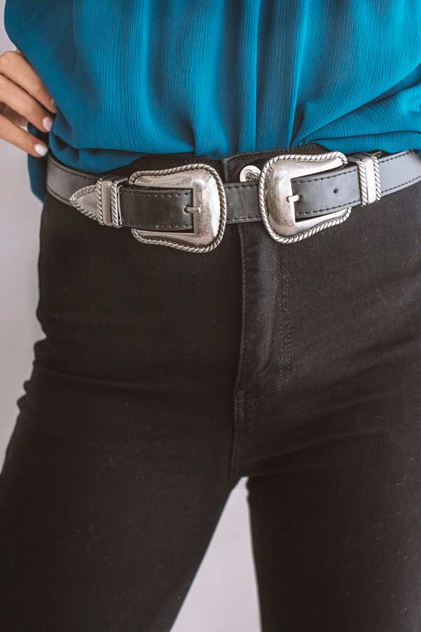 You will look like a rockstar when you accessorize with the black "All That Jaxx" belt featuring a sleek faux leather band with two large silver buckles!