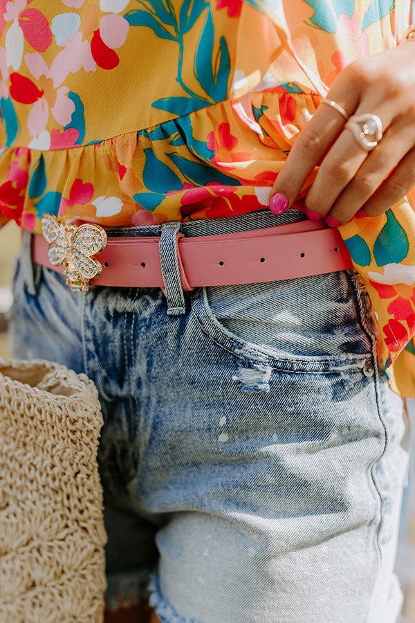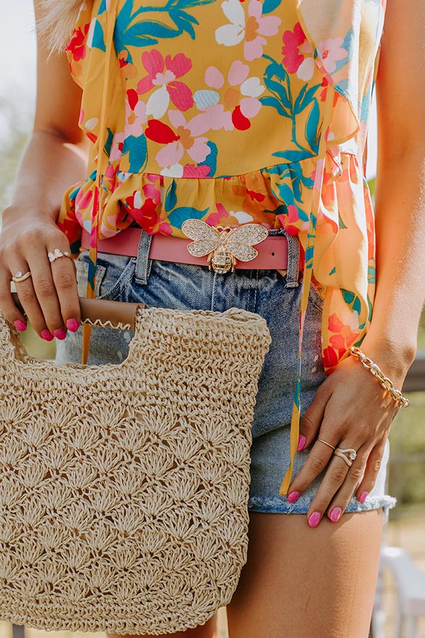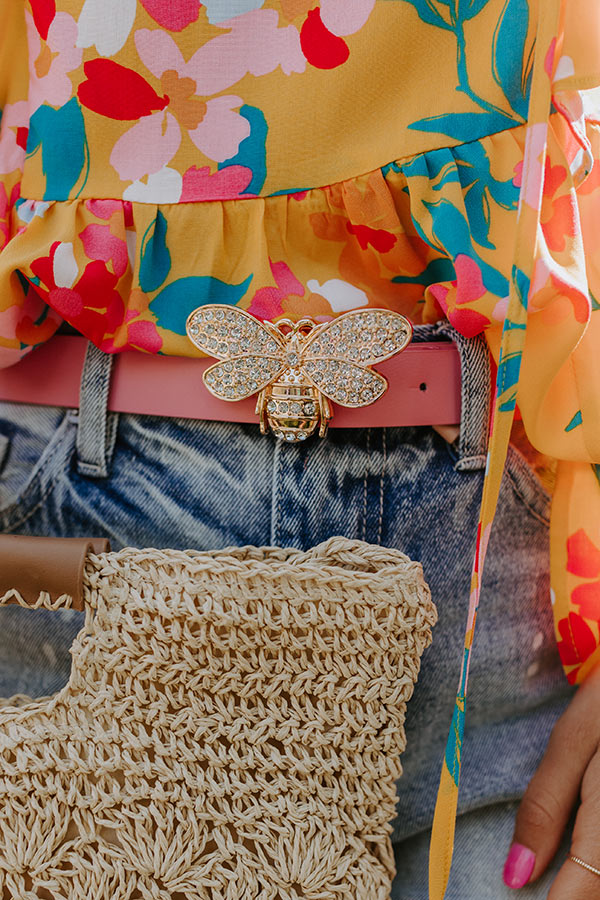 Believe us when we say this adorable belt will be all the buzz this summer with its blush colored faux leather strap and gold rhinestone embellished bumble bee buckle!