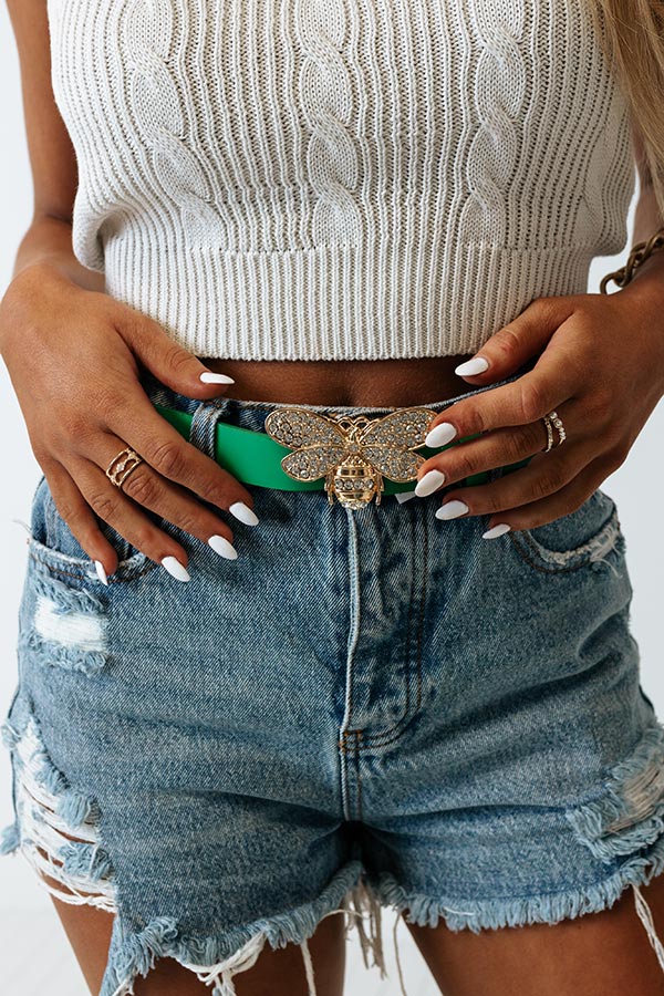 Believe us when we say this adorable belt will be all the buzz this summer with its green faux leather strap and gold rhinestone embellished bumble bee buckle!