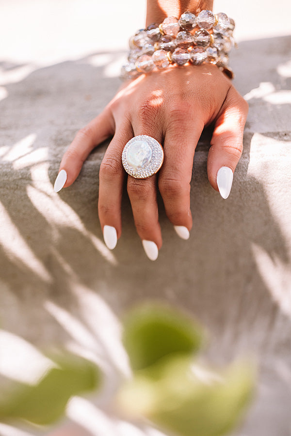 You are sure to receive "all the compliments" when you accessorize with this adorable ring featuring a large circle mother-of-pearl gem surrounded by shimmering rhinestones!