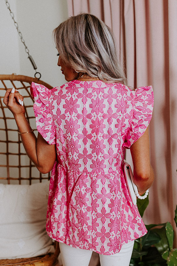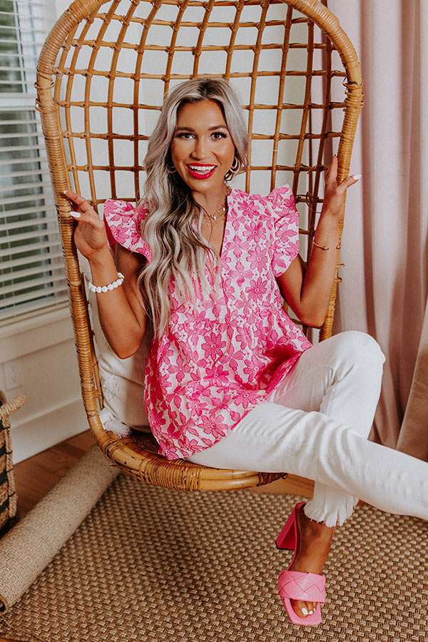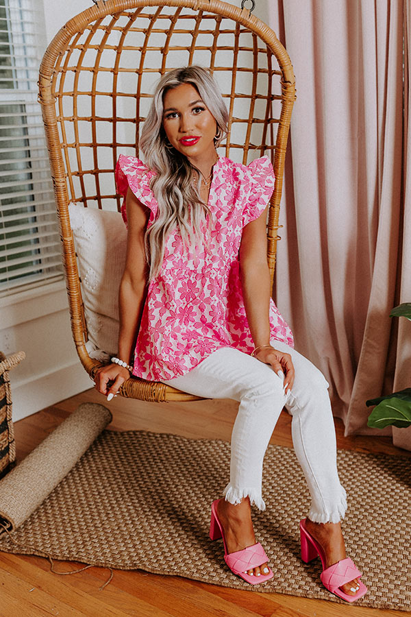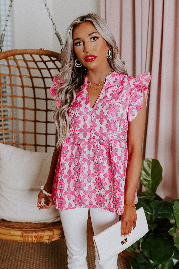 You are guaranteed to have all the fun in this darling shift top featuring lightweight material patterned with a pink floral print, a v-cut neckline, ruffled cap sleeves, and a relaxed silhouette that falls into a straight hemline!
