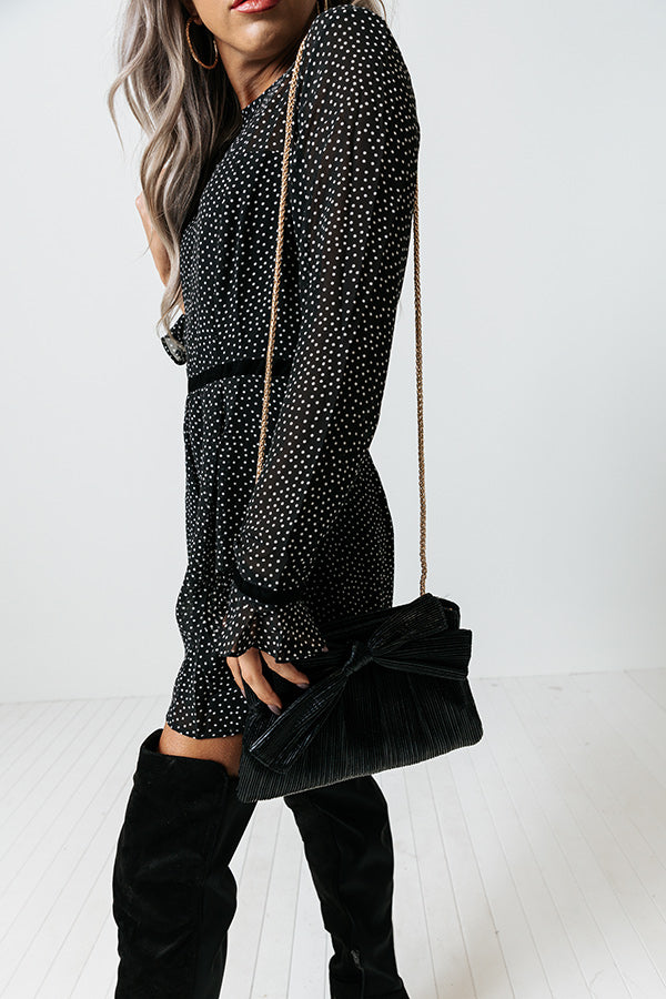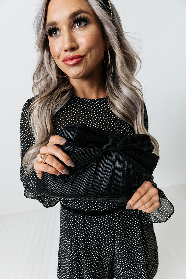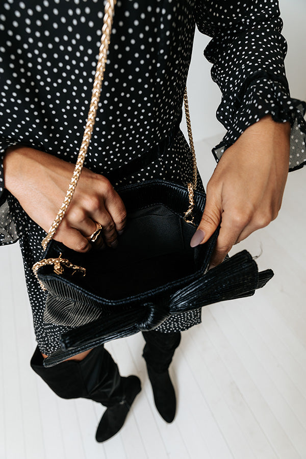 You will be bringing all the glamour with your outfit when you complete your look with this luxe clutch featuring shimmering black material with a large accent bow, a chain link shoulder strap, and a spacious fully lined pouch with a magnetic closure and additional inside pocket!