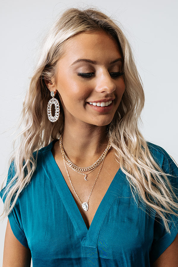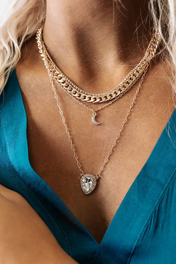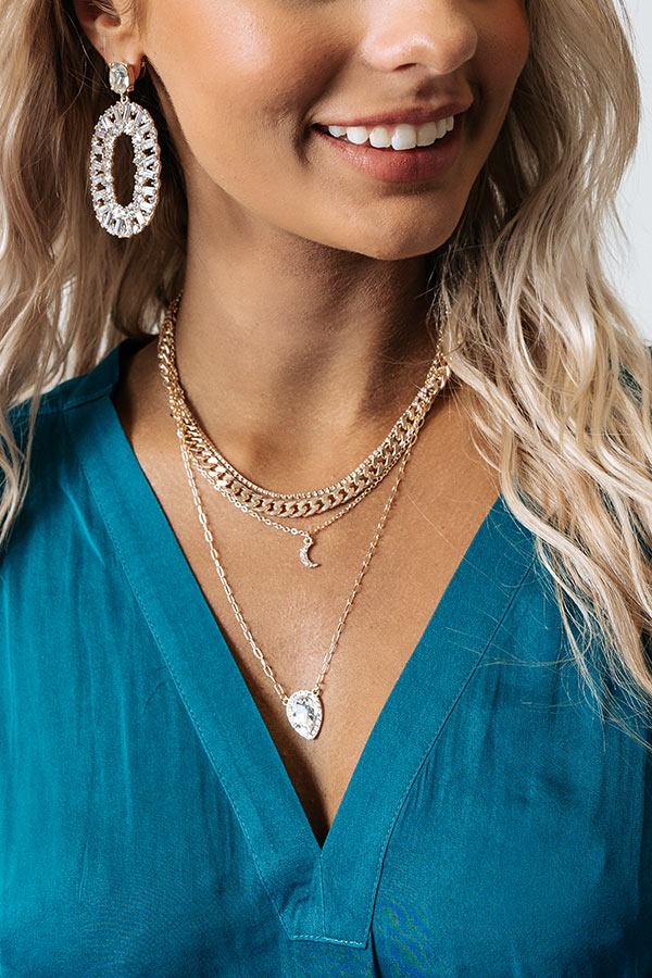 Add a glamorous touch to your look with this beautiful necklace featuring four layered pieces: a rhinestone choker, a large link choker, a dainty chain with a rhinestone crescent moon charm, and a longer dainty chain with a large teardrop rhinestone pendant!
