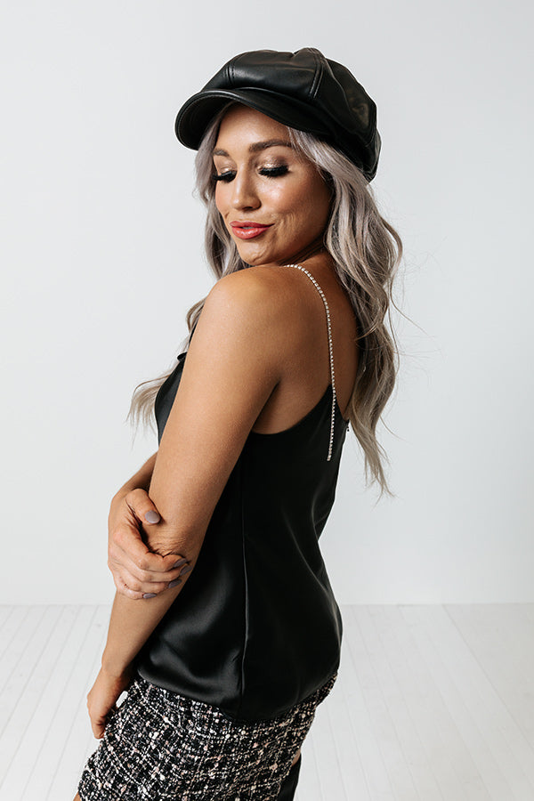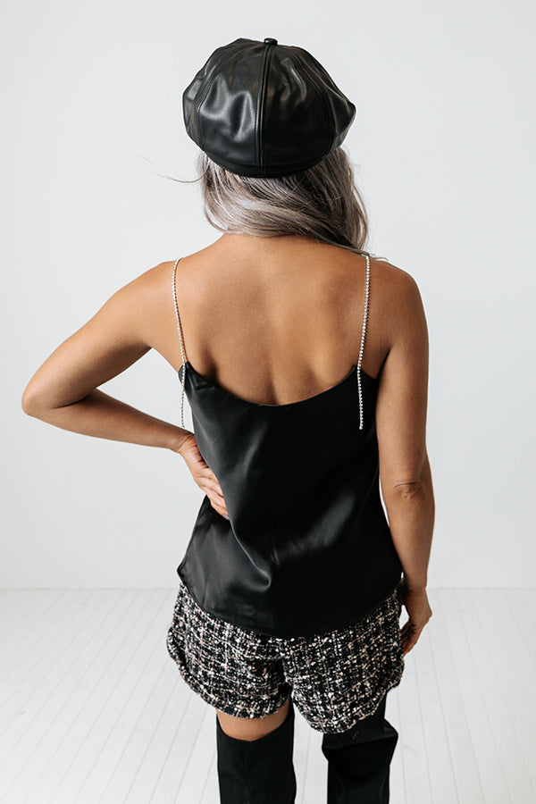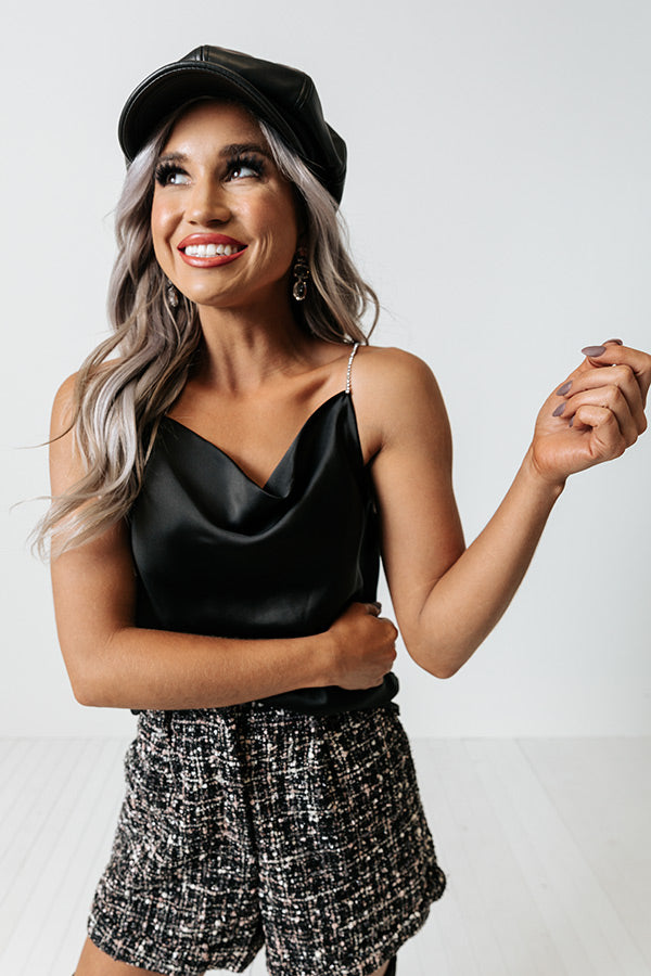 You won't find a more chic layered piece than this glamorous black top featuring sleek lightweight satin material, a scooped draped neckline, skinny rhinestone shoulder straps, an a relaxed silhouette that falls into a straight hemline!
