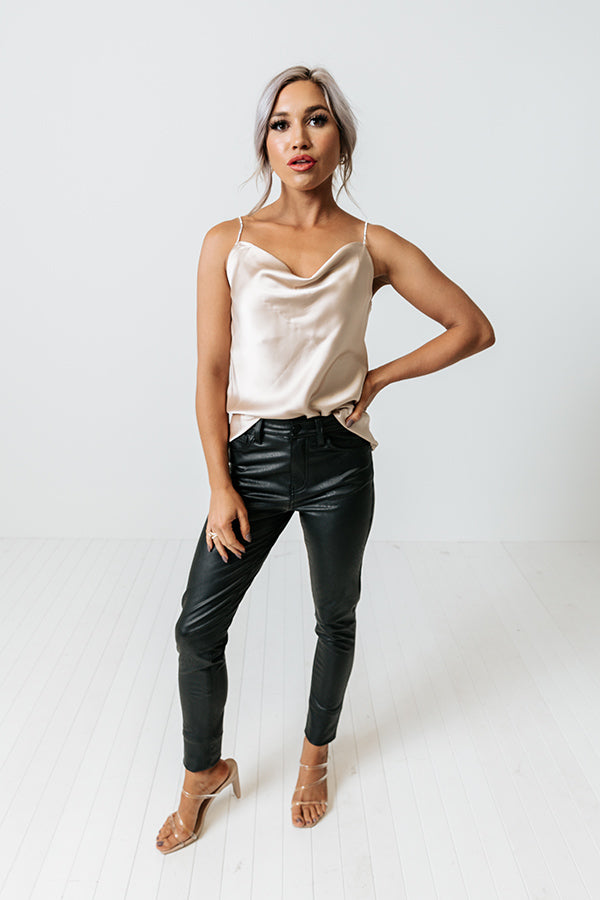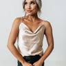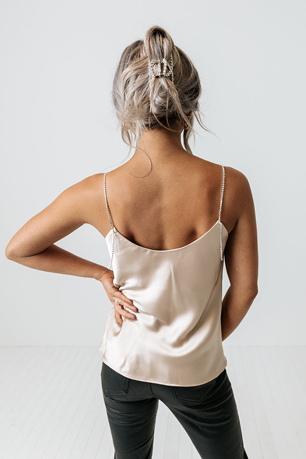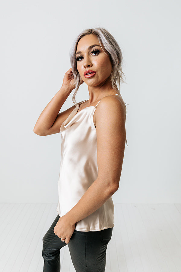 You won't find a more chic layered piece than this glamorous chamagne colored top featuring sleek lightweight satin material, a scooped draped neckline, skinny rhinestone shoulder straps, an a relaxed silhouette that falls into a straight hemline!